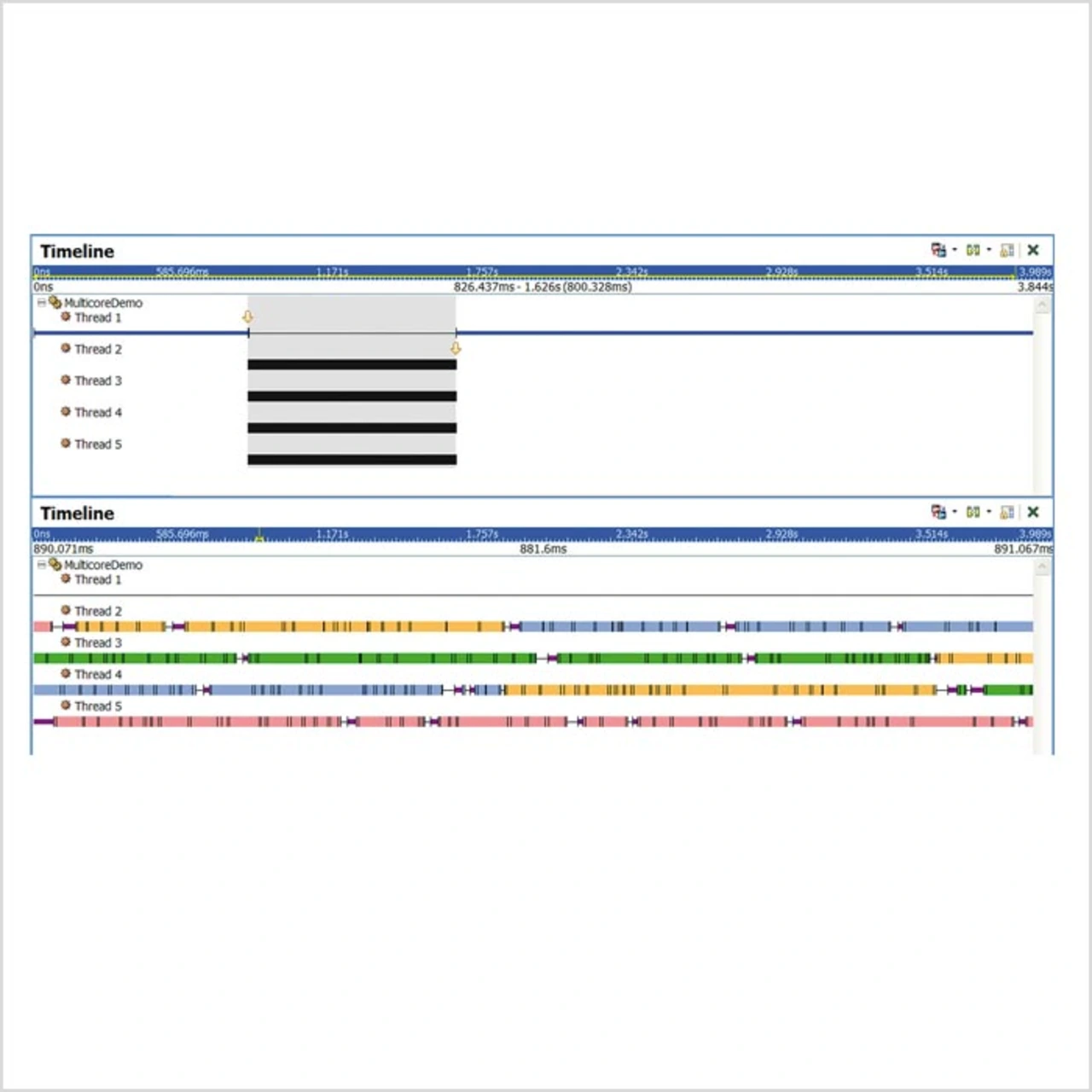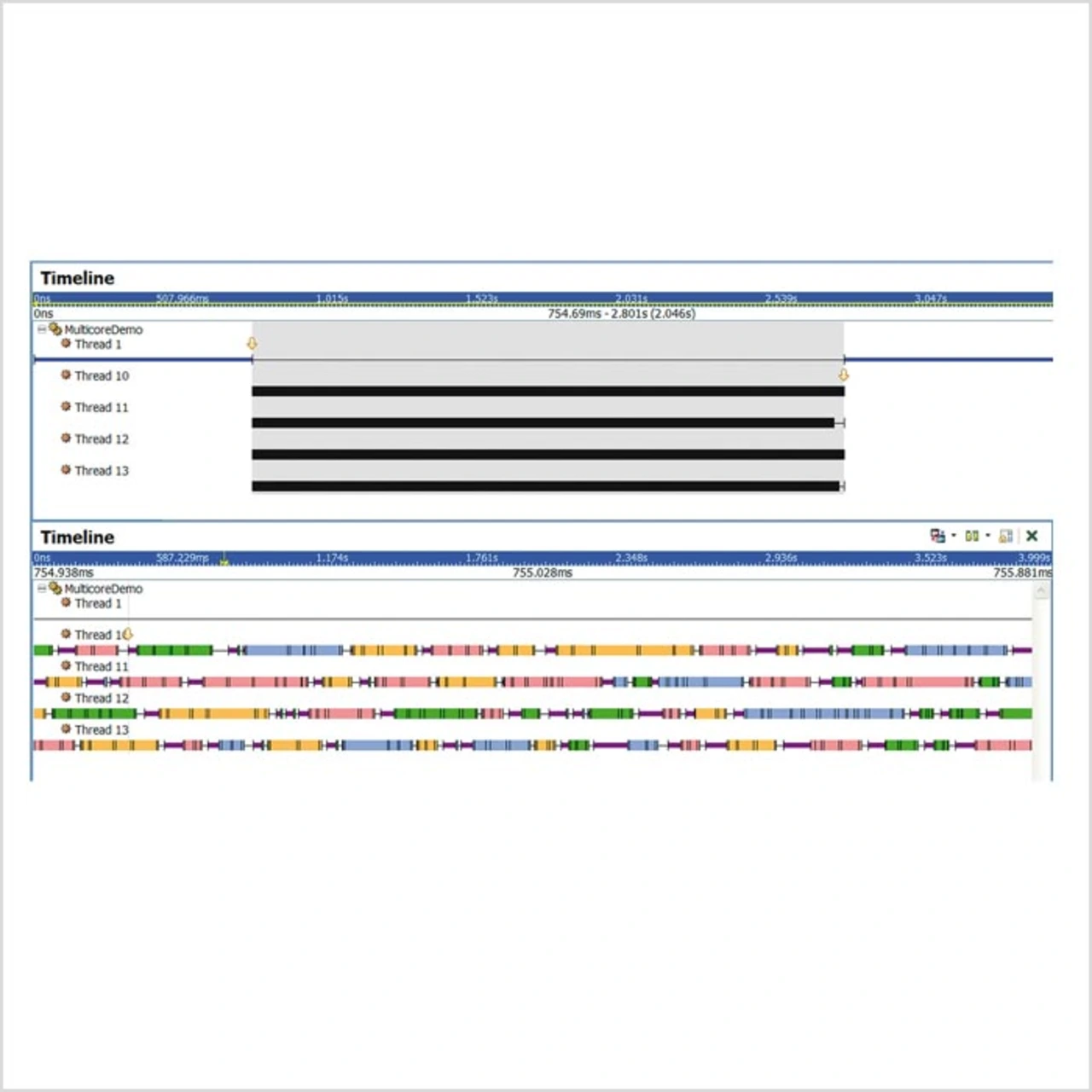 Interessanterweise brachte der Einsatz von noch mehr Mutexen keine weiteren Fortschritte. Im Gegenteil: Die Gesamtverarbeitungszeit stieg, sobald 40 Mutexe im Spiel waren. Mit anderen Worten: Zu viele Mutexe können die Performance verringern. Der springende Punkt ist aber, dass Software eben nur selten für Multicore- Umgebungen optimiert ist. Entwickler benötigen daher Visualisierungswerkzeuge, um das Systemverhalten zu verstehen und den besten Ansatz zur Verbesserung des vorhandenen Codes zu finden.