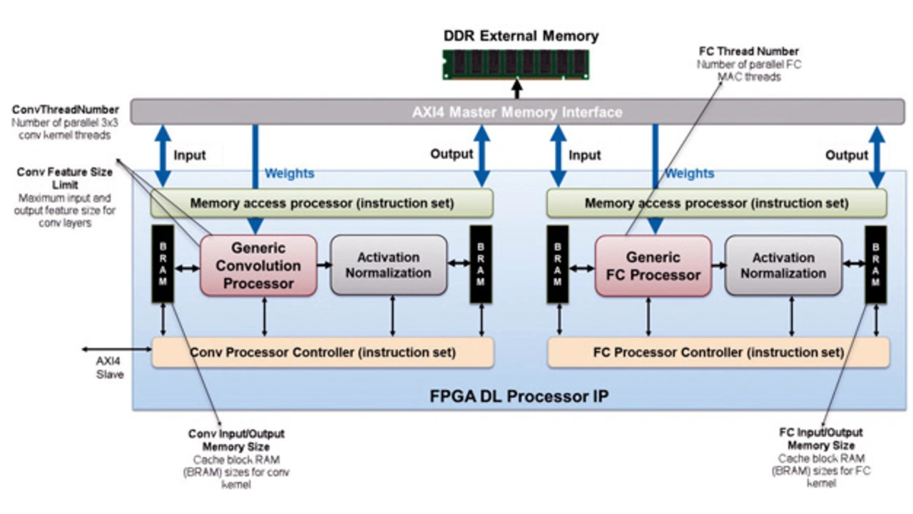 Bild 3 zeigt die vorgeschlagene Architektur des Deep-Learning-Prozessors. Die zu seiner Erzeugung nötigen Schritte sind im Folgenden beschrieben. Eingabebilder, Gewichte und Ausgabebilder werden im externen DDR-Speicher gespeichert und über AXI-Master-Schnittstellen mit dem Prozessor ausgetauscht. Weiterhin führt der generische Convolution-Prozessor die einer einzelnen Faltungsschicht entsprechende Faltungsoperation aus. Anschließend liefert er die Aktivierungen für das Normalisierungsmodul. Es dient zum Hinzufügen der ReLU-Nichtlinearität oder einer Maxpooling-Schicht oder er führt eine »Local Response Normalization« aus. Der generische Fully-Connected- (FC)-Prozessor führt die einer einzelnen vollständig verbundenen Schicht entsprechende Operation aus.