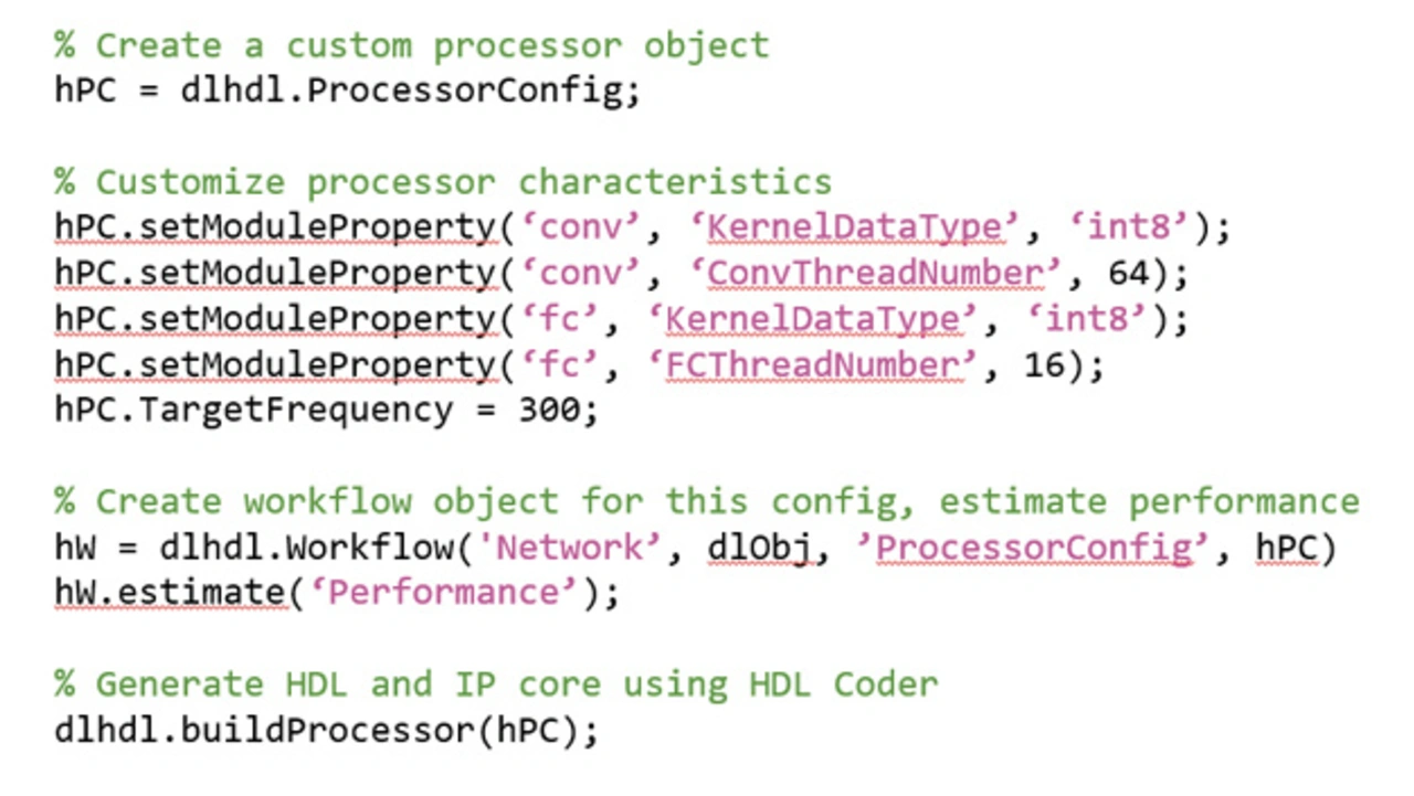 HDL Coder kann den vorgestellten synthetisierbaren IP-Core generieren. Für unterstützte Hardware Boards erfolgt das Bereitstellen ebenfalls automatisiert. Zusätzlich können Entwickler die Leistungsmerkmale und die Fläche für ein gegebenes tiefes neuronales Netz vor dessen Bereitstellen schätzen. Zudem erhöht die Festkomma-Quantisierung signifikant die Leistung in Bezug auf DDR-Speicherverbrauch, Latenzzeit und Fläche.