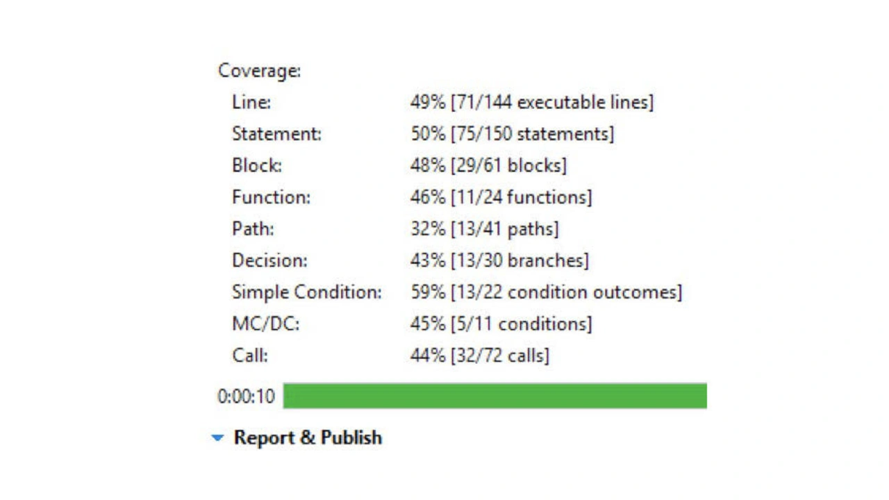Bei sicherheitskritischen Systemen muss nicht nur die Funktion, Sicherheit und Unbedenklichkeit nachgewiesen werden, sondern auch, dass es im Code kein Problem gibt, das von den Tests unberührt geblieben ist. Die Durchführung von Tests hängt von vielen Faktoren ab, aber in jedem Fall ist die Tool-Automatisierung der Schlüssel zur Erfassung der verschiedenen Metriken, die den Projektstatus anzeigen, egal ob es sich um Code- oder Anforderungsabdeckung handelt.
