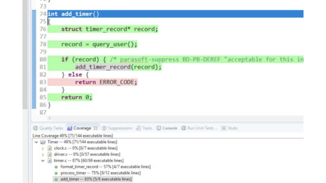 Ein Beispiel für einen Code-Abdeckungsbericht direkt in der IDE von C/C++test zeigt Bild 5, mit den während der Testausführung abgedeckten und nicht abgedeckten Zeilen.