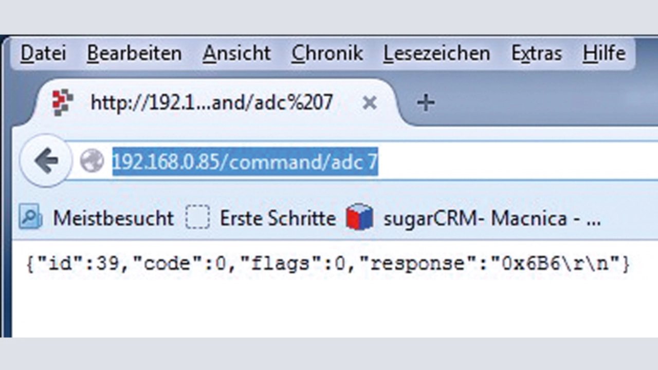 Um autonome Netzwerkknoten mit Aktor/Sensor-Funktion in bestehende Infrastrukturen einbinden zu können, müssen standardisierte Schnittstellen vorhanden sein, über welche die akquirierten Daten einfach ausgetauscht werden können. In WiConnect hat ACKme eine sogenannte »REST«-API geschaffen, die diesem Bedarf sehr gut entgegen kommt. REST steht für »Representational State Transfer« und bedeutet ganz einfach gesprochen, dass jede Funktion des Netzwerkgerätes über eine eindeutige URL abgerufen werden kann. So liefert zum Beispiel die URL-Eingabe »http://192.168.0.85/command/ver« (in der Browser-Adresszeile) exakt die gleiche Ausgabe wie das Kommando »version«, gibt also die Version von Firmware und Hardware des Moduls aus. Die Eingabe-URL »http://192.168.0.85/command/adc 7« gibt den aktuellen ADC-Wert des Thermistors in hexadezimaler Schreibweise wieder (hier also 0x6B6) und entspricht der Temperatur der Platine (Bild 6).
