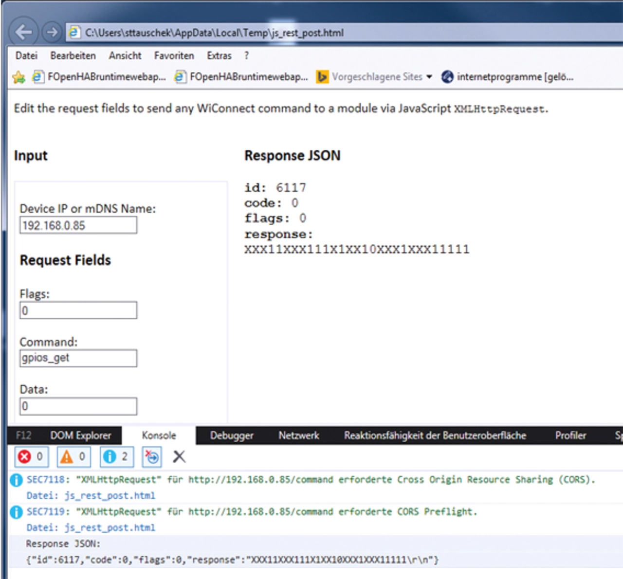 Die Rückgabe des Moduls ist nicht ein einzelner Wert, sondern ein Datenobjekt, genauer ein sogenanntes JSON-Objekt. JSON steht für »JavaScript Object Notation«, ähnelt ein wenig XML und kann von JavaScript interpretiert werden. Um die Ein- und Ausgaben der RESTful-API etwas komfortabler zu gestalten, bietet ACKme ein kleines Demoprogramm zum Download. Diese einzelne html-Seite lässt sich lokal öffnen und dient zur schnellen Abfrage von Variablen und Parametern eines ACKme-Moduls. In Bild 7 werden mit einer Abfrage »http://192.168.0.85/command/gpios_get« die Zustände aller GPIOs des Wallaby-Moduls ermittelt.