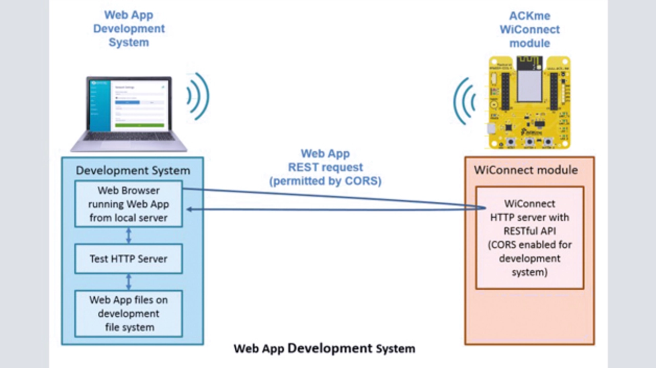 Möchte man die ACKme-Module nicht nahtlos in einer Automatisierungsumgebung einsetzen, sondern als eigenständigen Wi-Fi-Aktor-/Sensorknoten mit entsprechender Repräsentation über die eingebaute Webseite, ist zumeist eine anwendungsspezifische Anpassung der Webanwendung notwendig. Diese setzt auf der sogenannten »WiConnect JavaScript«-API auf, ein Framework zur Steuerung von WiConnect-Geräten unter Nutzung der HTTP-RESTful-API (Bild 8).