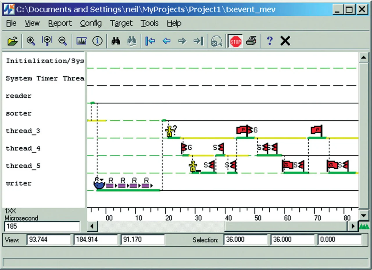Eine Methode zur Erzeugung trace-ähnlicher Information auf Systemen ohne RTT-Ports wurde durch mehrere Anbieter von Echtzeit-Betriebssystemen (RTOS) implementiert. Spezielle Funktionsaufrufe oder instrumentierte Kernel-Varianten bieten eine High-Level-Ansicht von Betriebssystem-Ereignissen über die Zeit. Der Entwickler kann sehen, welche Threads laufen und wann Betriebssystem-Ereignisse stattfinden (Bild 2), doch es fehlen die Möglichkeiten des Source-Level-Debuggings oder der Timing-Analyse eines echten Echtzeit-Trace-Entwicklungssystems.