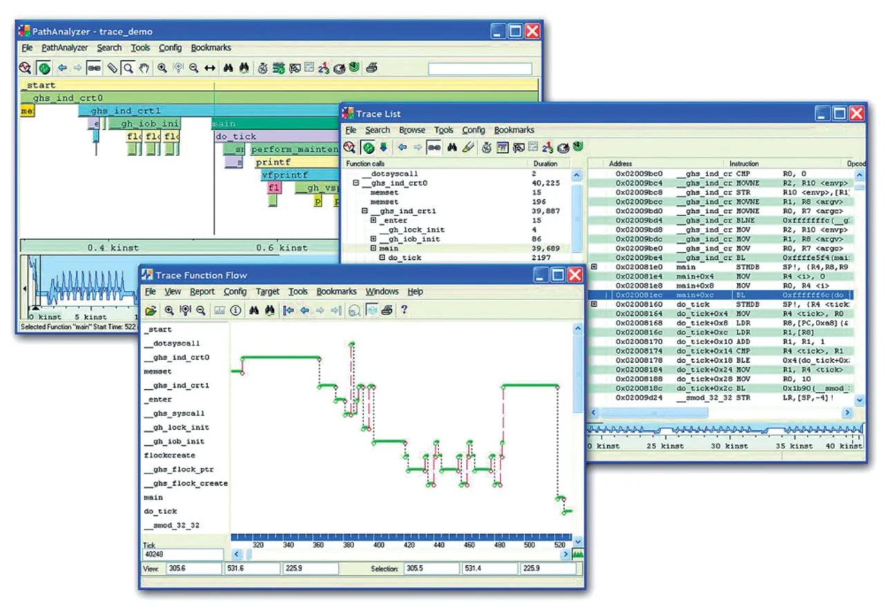 Eine der jüngsten Neueinführungen von Trace-Probes hoher Kapazität und unterstützender Tools hat die Einsatzmöglichkeiten von Echtzeit-Trace in der Software-Entwicklung stark erweitert. Ähnlich einem digitalen Videorecorder erfassen diese Entwicklungssysteme Milliarden von Prozessorzyklen und erlauben es, das Programm anschließend vorwärts und rückwärts „abzuspielen“. Hochentwickelte Visualisierungs-Tools sorgen für ein klares Bild darüber, was im Quellcode, auf dem Call-Stack oder auf Thread-Ebene geschehen ist. Tools zur detaillierten Timing-Analyse können rasch Code- und Speicher-Engpässe identifizieren und so Hinweise zur Optimierung anbieten. Tools zur statistischen Analyse tragen mit Leichtigkeit zum Auffinden kurzzeitig auftretender Bugs oder von anormalen Programmverzweigungen bei (Bild 1).