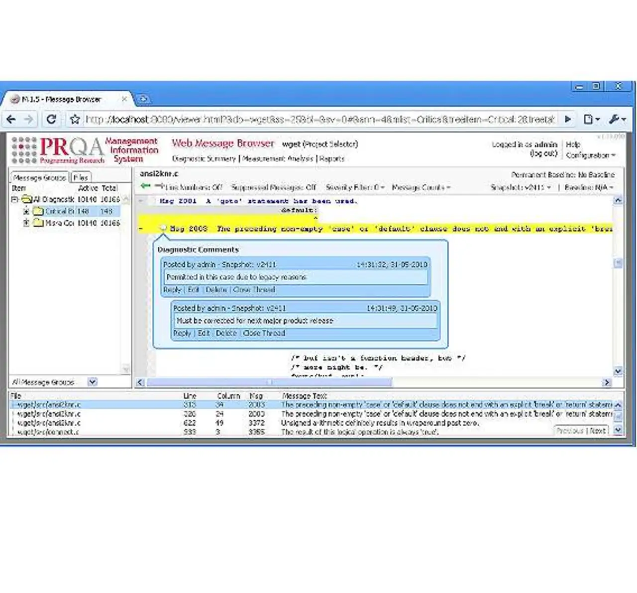 Der Softwarequalitäts-Manager hat einen weiteren Verantwortungsbereich, der über die aktuelle Normerfüllung für ein gegebenes Projekt hinausgeht. Oft konzentriert er sich auf bereichsübergreifende Maßnahmen für die Qualität und achtet mehr auf den Prozess als auf ein bestimmtes Produkt. MIS erfasst bereits ein breites Spektrum von sprachbezogenen Bewertungsmaßstäben aus den Parser-Analysewerkzeugen für Abschnitte des Quellcode-Projekts einschließlich aller Funktionen, Klassen und Dateien. Darüber hinaus bietet MIS Funktionen, um abgeleitete Bewertungsmaßstäbe auf der Basis seiner umfassenden Bibliothek von Analysedaten und Bewertungsmaßstäben erstellen und speichern zu können. Beispiele für abgeleitete Bewertungsmaßstäbe sind der Durchschnittswert der Regelabweichungen pro Datei, die Dichte kritischer Programmfehler pro Funktion, die Anzahl neu entstandener Regelabweichungen seit einer definierten Baseline.