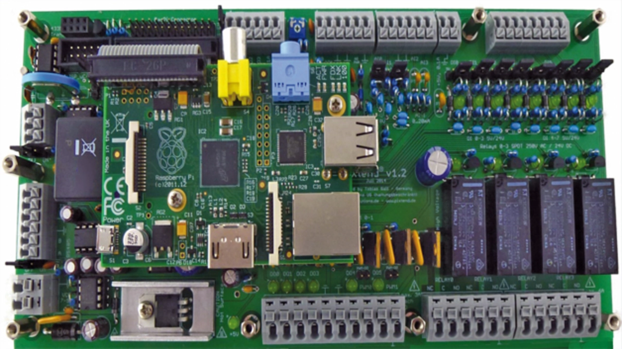 Das PiXtend-System (Bild 3) ist in vier Varianten erhältlich: als Fertiggerät, als Bausatz mit vorbestückter Platine, als Bausatz mit allen Komponenten, die dann alle selbst zu bestücken sind, und es wird auch nur die Platine angeboten. Optional gibt es ein passendes Gehäuse für die Hutschienenmontage und zudem eine Abdeckung aus Edelstahl, was dem System einen professionellen Look (Bild 4) verleiht. Eine CE-Zertifizierung, die es ohnehin nur für das Fertiggerät geben kann, wird mit der neuesten Version, die mit SMD-Komponenten aufgebaut sein wird, angestrebt.