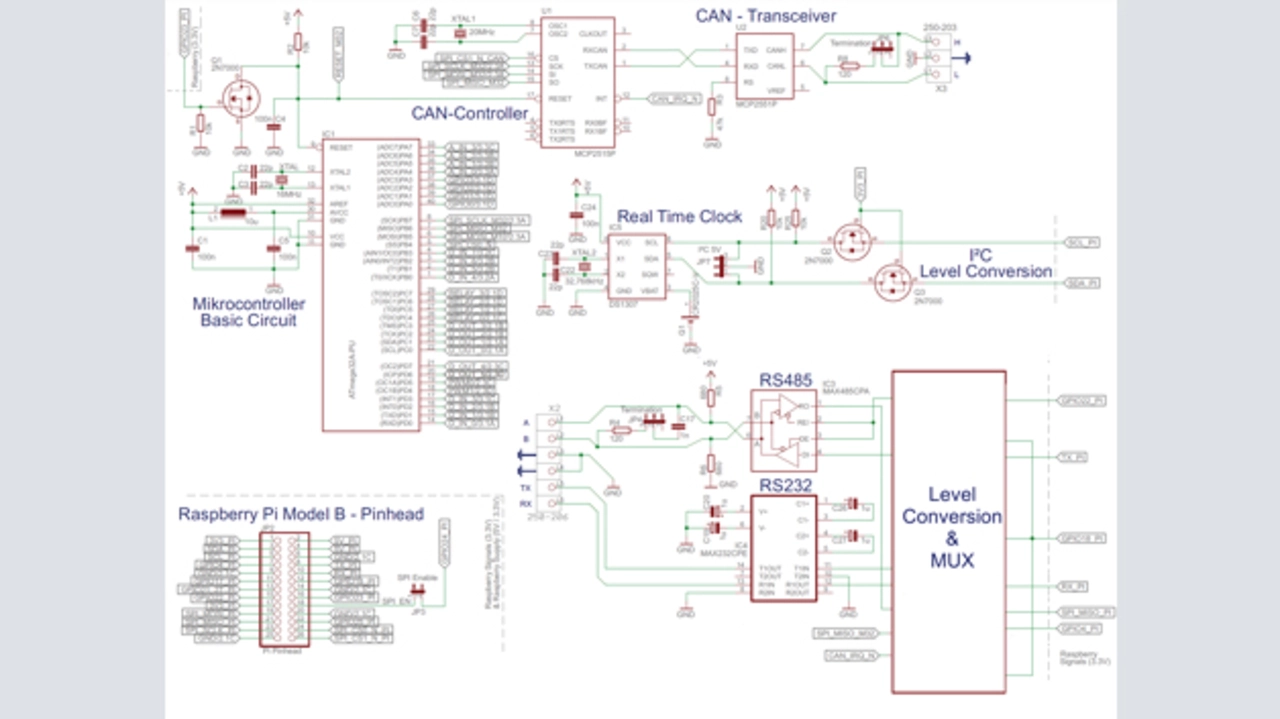 Sowohl für die RS-232- als auch für die RS-485-Schnittstelle werden die Leitungen TX und RX vom Raspberry Pi verwendet, denen entsprechende Treiber (MAX232, MAX485) nachgeschaltet sind. Demnach gibt es keine Übergabeleitungen oder sonstige Signale, weshalb die RS-232-Schnittstelle hier tatsächlich nur in der Minimalausführung realisiert wurde. Außerdem ist kein gleichzeitiger Betrieb dieser beiden Schnittstellen möglich. Die entsprechende Ein- bzw. Umschaltung der beiden Schnittstellen erfolgt durch drei GPIO-Leitungen vom Raspberry Pi. Eine weitere GPIO-Leitung des Raspberry Pi (GPIO17) ist für einen 433-MHz-Transceivers vorgesehen. Die passenden Typen (z.B. FS1000A) sind handelsüblich und werden für die bekannten Funksteckdosen eingesetzt, wie man sie beispielsweise im Baumarkt findet.