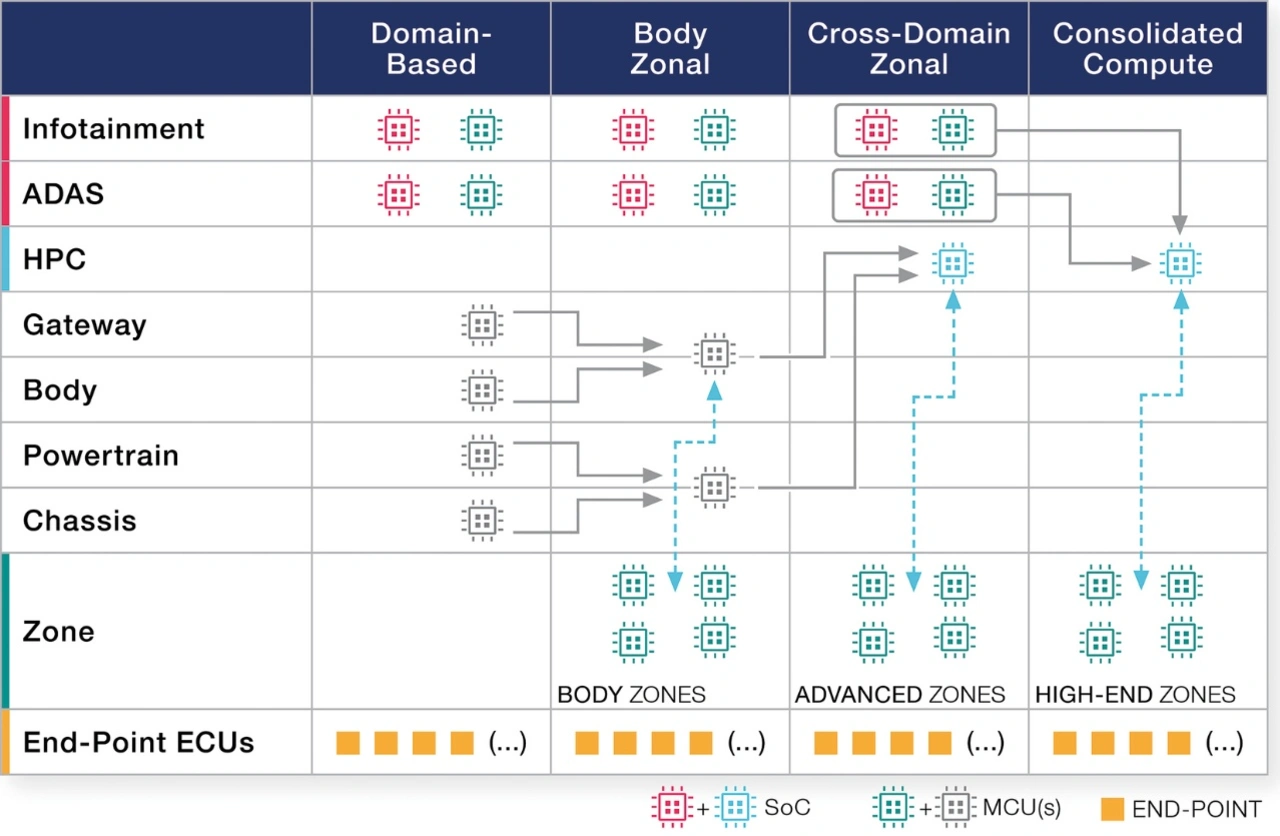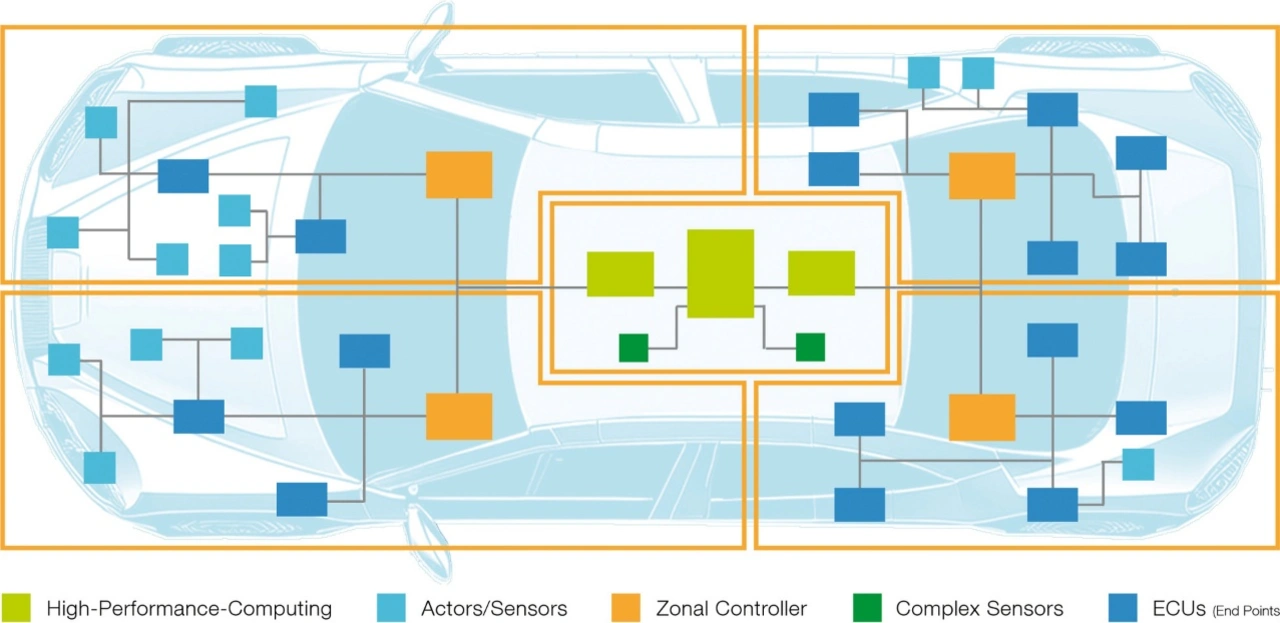 Bild 3 zeigt einen Vorschlag, der neben immer noch zahlreichen Endpoint-MCUs an den Sensoren und Aktoren vier sogenannte Zonen-Controller enthält. Dies sind leistungsfähigere Chips, die jeweils einen bestimmten Bereich des Autos steuern (hier: vorn links, vorn rechts, hinten links und hinten rechts) und mehrere Funktionen integrieren. Es gibt auch alternative Vorschläge mit sechs Zonen-Controllern, wobei die Längsachse des Autos dann in »Vorn«, »Mitte« und »Hinten« aufgeteilt ist. An der Spitze der Hardware stehen in Bild 3 drei High-Performance-SoCs. Es handelt sich dabei um High-End-Chips wie Qualcomms Snapdragon, Nvidias Drive Orin/Thor, NXPs S32N55 Super Vehicle Integration Processor oder Renesas R-Car der 5. Generation.
