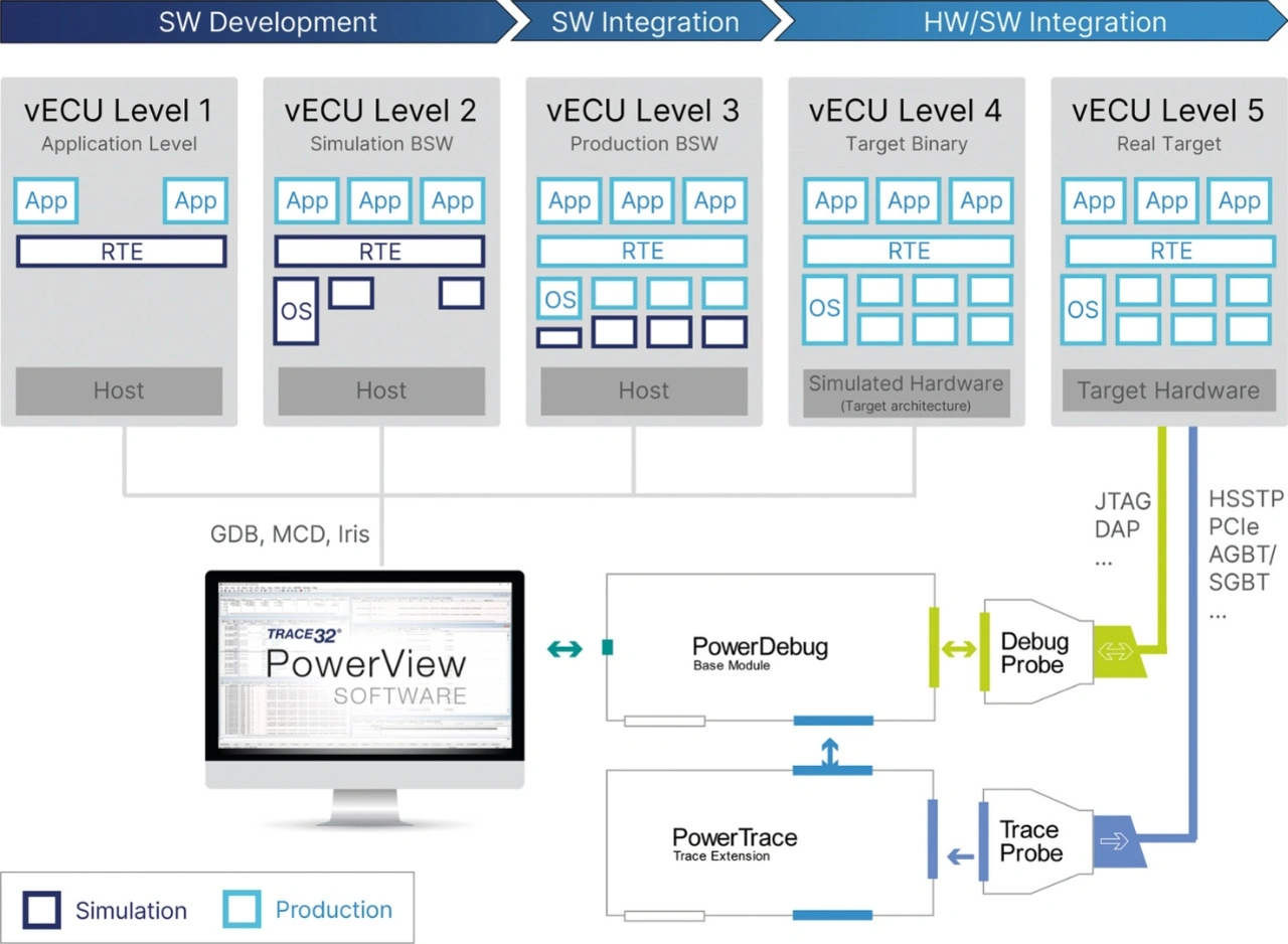 Aus Kundensicht ist es selbstverständlich wünschenswert, mit einer Toolchain und einer GUI alle Level einer ECU debuggen zu können, um keinen Bruch im Entwicklungsprozess zu haben. Lauterbachs Trace32 unterstützt den »Shift-Left«-Ansatz, indem es nicht nur reale Chips in Silizium unterstützt, sondern auch über unterschiedliche Schnittstellen virtuelle Targets und Emulatoren verschiedener Partneranbieter, auf denen Softwareentwicklung bereits möglich ist, wenn keine realen Chips in Silizium verfügbar sind (Bild 5). Die Funktionen und die GUI der Trace32-PowerView-Software unterscheidet sich nicht von realen Targets, sodass man während des gesamten Entwicklungszyklus die gleiche Benutzererfahrung hat.