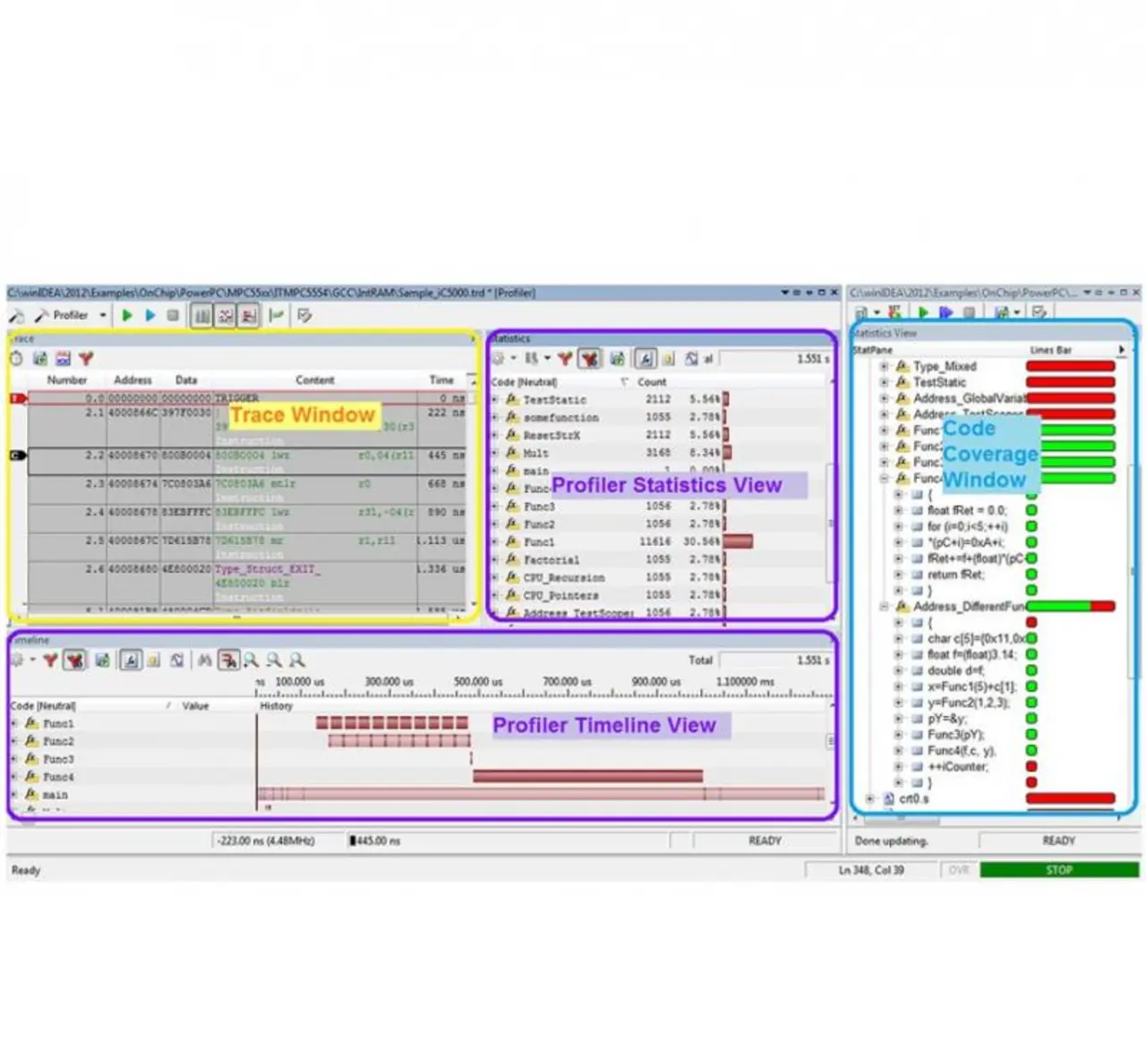 Debugtest: Verbindet man nun den iC5000 über die Nexusschnittstelle und startet den Trace, so zeigt winIDEA – noch während die Anwendung läuft – den kompletten Programm- und Datenfluss an. Die Datenerfassung erfolgt in Echtzeit, d.h. ohne Stoppen oder Verlangsamen der MCU und ohne Beeinflussung des Verhaltens der Anwendung. Zusätzlich kann der Eingang und die Reaktion auf externe Signale (z.B. AUX) erfasst werden.