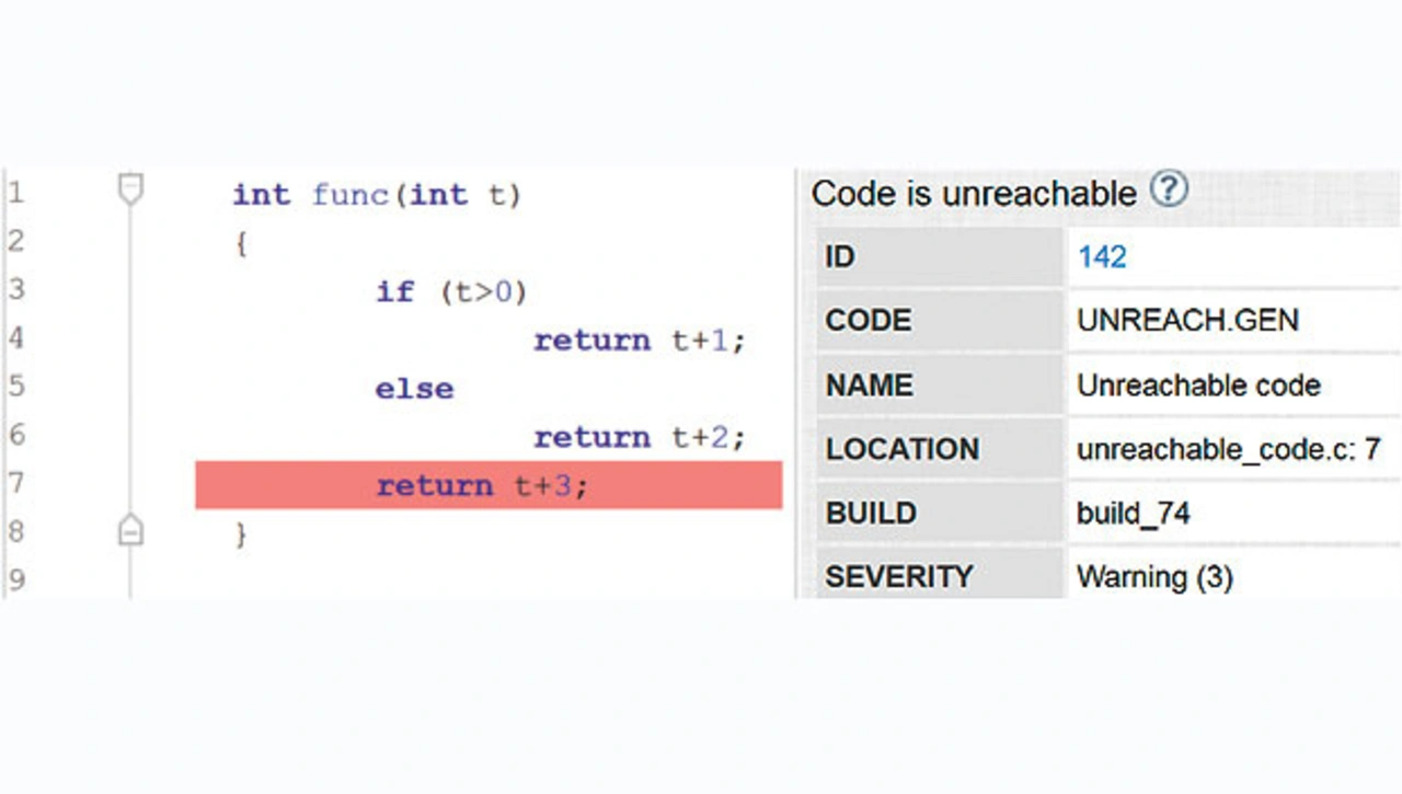 In Bild 3 ist eine Situation mit unerreichbarem Code dargestellt. Die return-Anweisung in Zeile 7 wird niemals ausgeführt, weil die Funktion func() schon zuvor entweder durch die return-Anweisung in Zeile 4 oder die return-Anweisung in Zeile 6 verlassen wird. Im vorliegenden Fall mag das offensichtlich sein, aber im Allgemeinen erfordert die Aufdeckung von unerreichbarem Code fortgeschrittene Analysefähigkeiten.