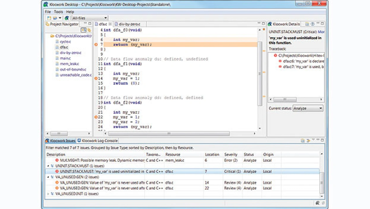Im Beispiel in Bild 4 sind alle drei Datenflussanomalien vorhanden und sie werden auch alle von Klocwork erkannt. Dabei stuft Klocwork die Verwendung der nicht initialisierten Variablen mit der Gewichtung „critical“ in die höchste Stufe ein, denn dies kann zu beliebigem Programmverhalten führen. Die beiden anderen Anomalien bekommen die Gewichtung „review“ (niedrigste Stufe) zugewiesen, denn hier reicht es aus, sie bei Gelegenheit einmal anzuschauen.