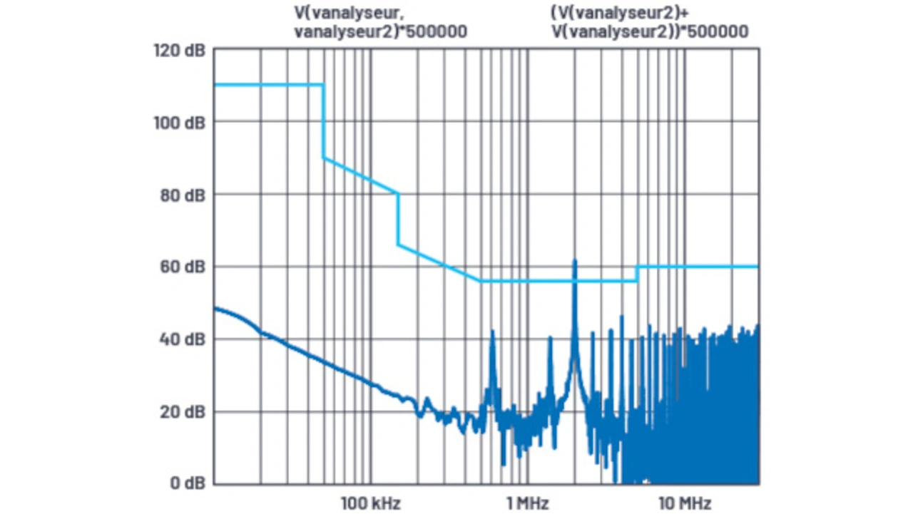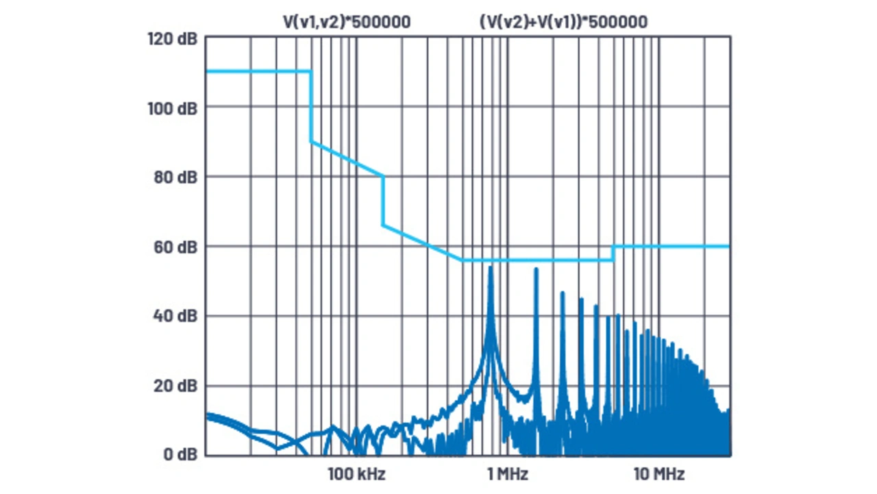 Das Demo-Board DC2822A (Bild 18) verfügt über die beiden Stromversorgungs-Anschlüsse VIN und VEMI. Der Anschluss VIN umgeht die Ferritperle auf der Leiterplatte, und das LTspice-Modell in Bild 19 entspricht der VIN-Konfiguration des Demo-Boards. Bild 20 gibt das FFT-Diagramm der LTspice-Simulation wieder. Es ist zu erkennen, dass die Gleichtakt-Störaussendungen bei 2 MHz bis knapp über das Limit reichen.