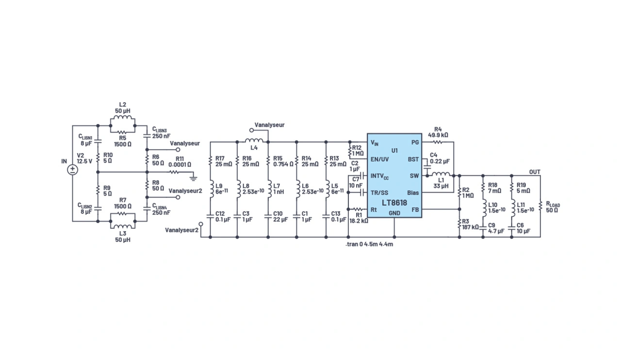 Mit LTspice-Simulationsschaltungen und -Methoden lassen sich differenzielle Störungen und Gleichtakt-Störgrößen in Abwärtswandlern simulieren. Damit können zu hohe Resultate bei EMV-Labormessungen zuverlässig vorhergesagt werden – wie das Beispiel mit einem Demo-Board zeigt.