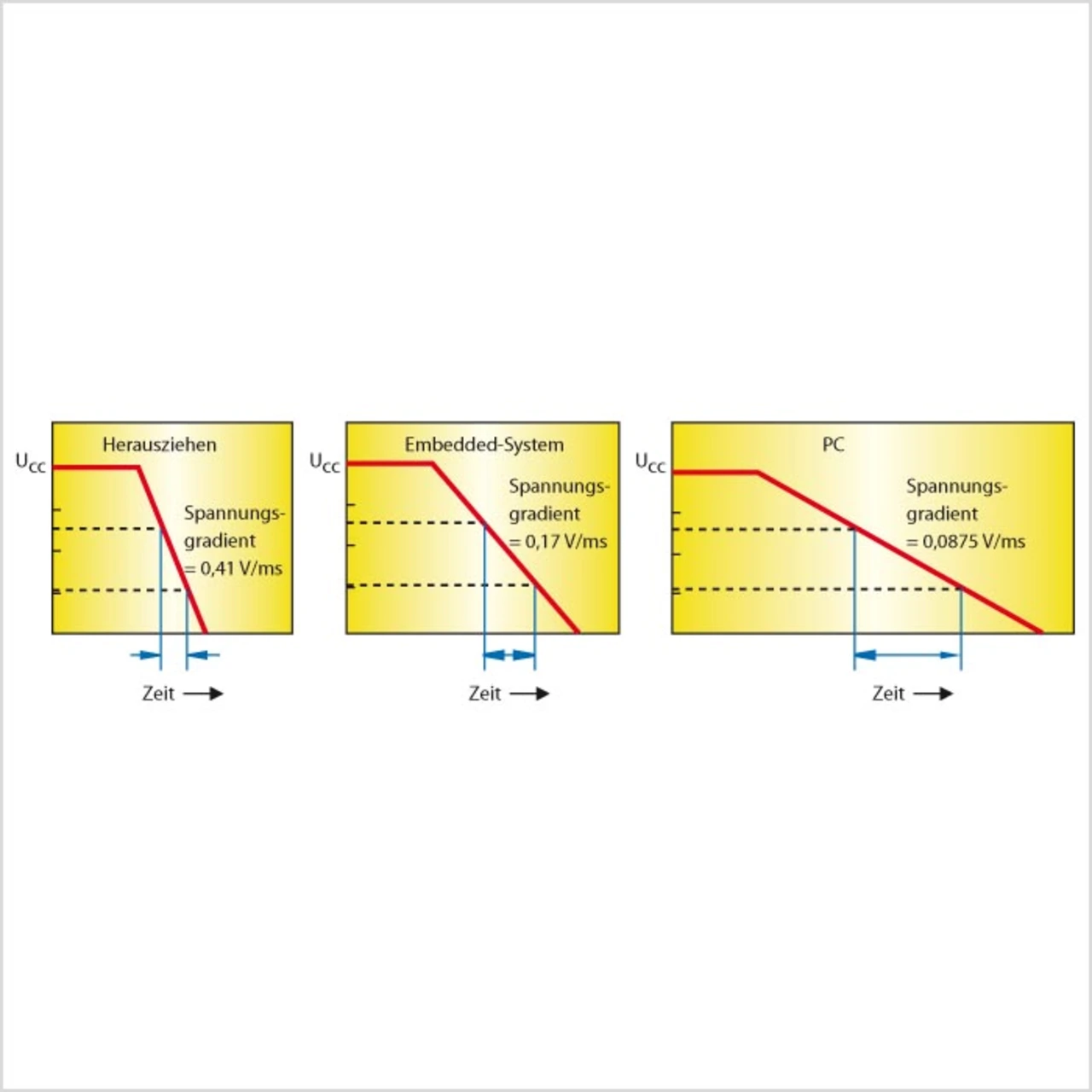 Flankensteilheit beim Abschalten an allen Spannungs- und I/O-Pins: Je steiler die Flanke, desto schneller fällt die Spannung unter die Abschaltgrenze der Speicherkomponente ab, und die Fehlerwahrscheinlichkeit steigt. Bild 3 zeigt Spannungsrampen für drei verschiedene Systeme. Die Flankensteilheit des Standard-Desktop-PCs und Embedded-Systems simulieren den Ausfall der Systemspannung. Der Power-Down-Tester kann auch die Steilheit des Spannungsabfalls für den Fall berücksichtigen, dass das Flash-Laufwerk während des Beschreibens herausgezogen wird. Abfallzeiten sind variabel und in hohem Maße abhängig von der jeweiligen Applikation. Ein Power-Down-Tester sollte so ausgelegt sein, dass er das Worst-Case-Szenario validieren kann.