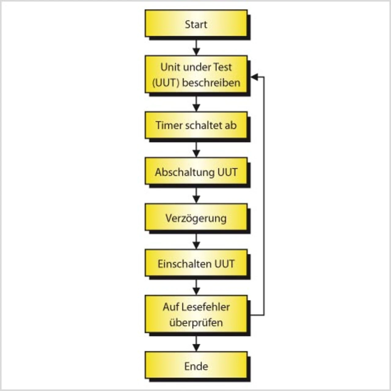 Validierung und Verifizierung: Sektoren-Lesefehler können an jeder Stelle auftreten, und das Speichergerät funktioniert trotzdem weiter. Im schlimmsten Fall tritt der erste Sektoren-Lesefehler in einer kritischen Systemdatei auf. Der Entwickler kann dann die Prüfung weiter durchführen, bis das Laufwerk nicht mehr funktioniert. Der Umfang der durchgeführten Verifikation hat eine direkte Auswirkung auf die Testzeit. Ein Testen nach jedem Zyklus wäre unter Umständen zu aufwendig. Bild 4 zeigt das Ablaufdiagramm eines beispielhaften Testers.