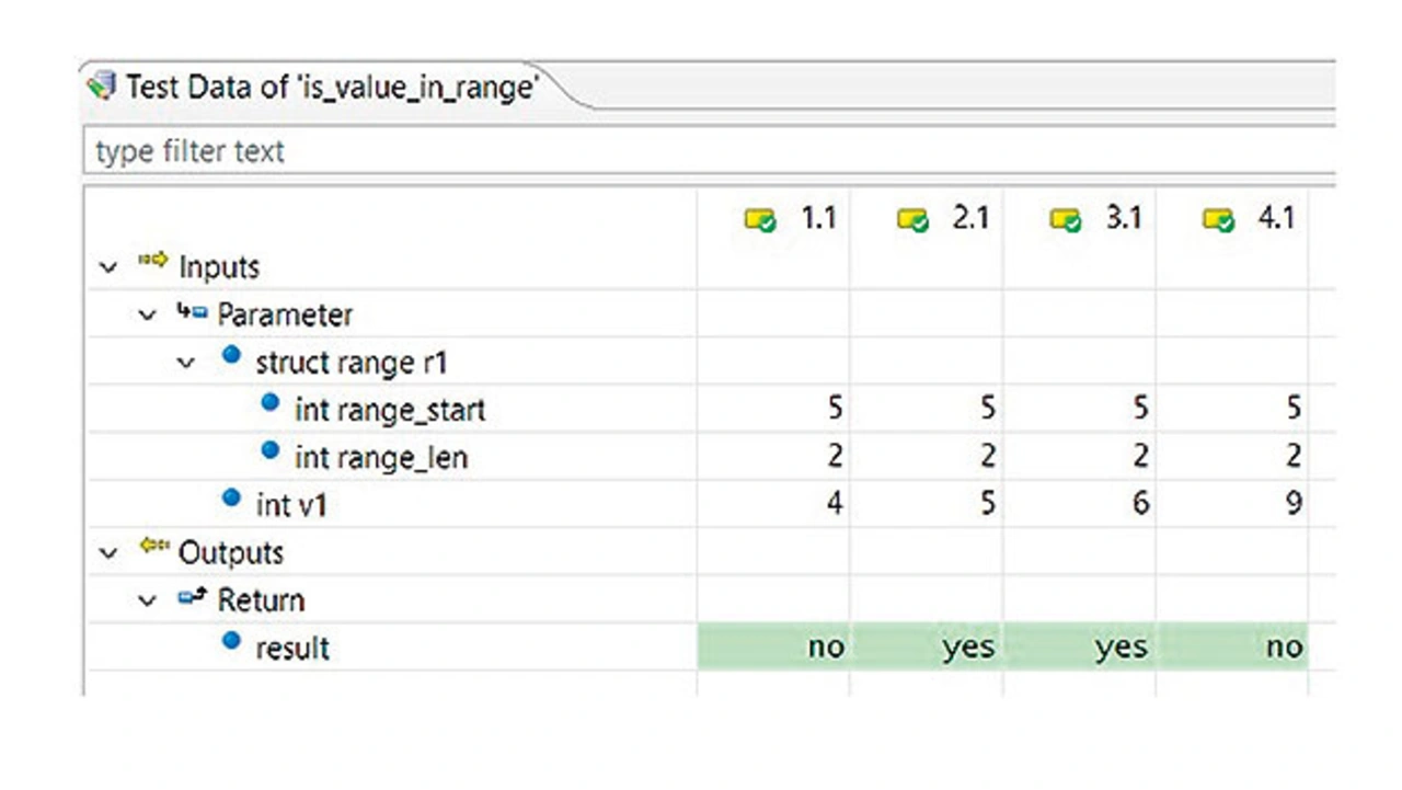 Testfall 2 und Testfall 4 haben deswegen unterschiedliche Qualität, weil Testfall 2 einen Grenzwert (Boundary Value) verwendet und Testfall 4 nicht. Testfall 2 verwendet nämlich mit dem Wert 5 den Startwert des Bereichs, der bei 5 startet und die Länge 2 hat und somit die Werte 5 und 6 enthält. Testfall 4 verwendet mit dem Wert 9 für die Variable v1 keinen Grenzwert des Bereichs. Dies demonstriert, wieso Grenzwerte gute Testdaten sind und wieso Standards zur Entwicklung von sicherheitskritischer Software Grenzwerte als Testdaten empfehlen.