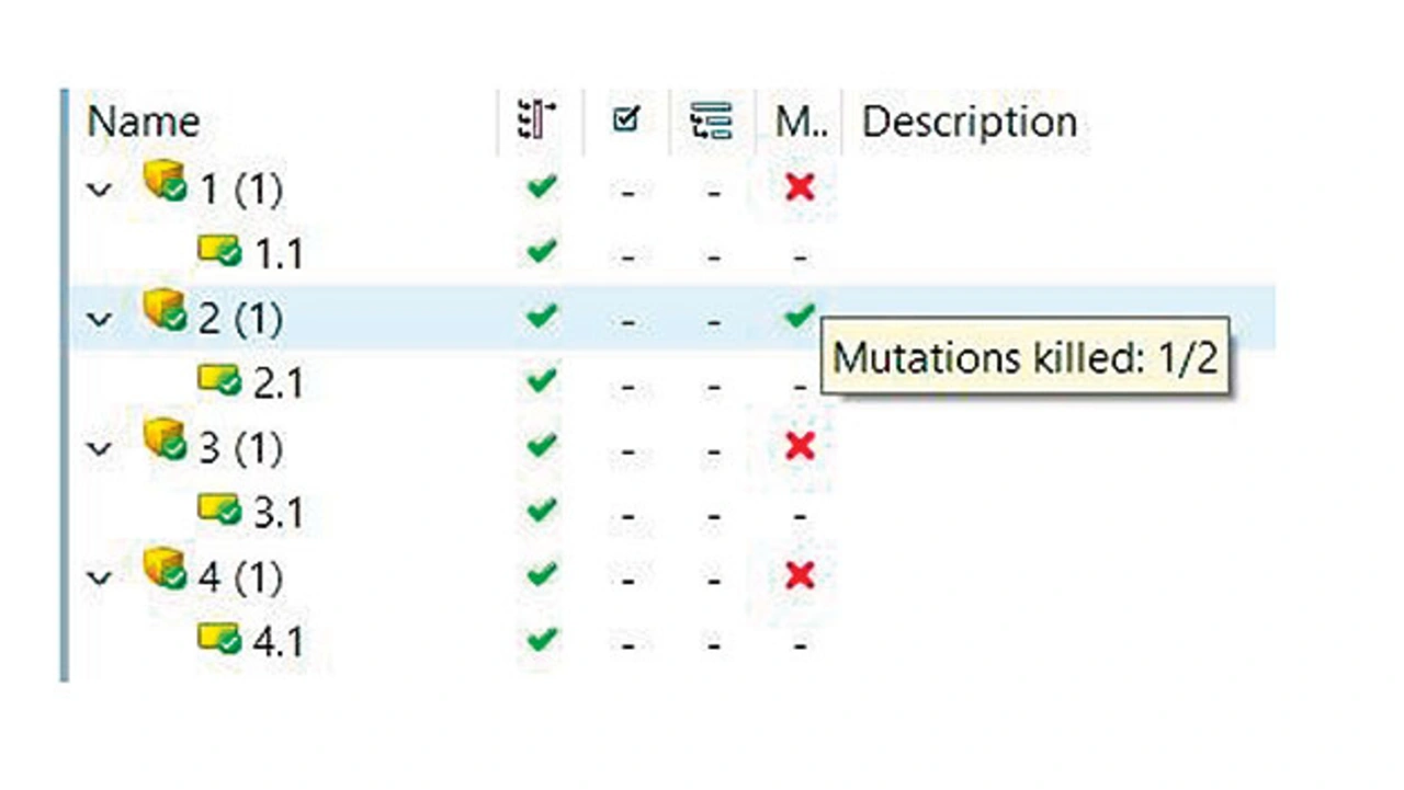 Der Mutation Score ist das Verhältnis von getöteten zu allen Mutationen. In Bild 5 ist der von TESSY ermittelte Mutation Score der vier Testfälle angeben. Testfall 2 hat eine der zwei Mutationen getötet, was 50 Prozent entspricht. Weil er einen Mutanten getötet hat, ist Testfall 2 mit einem grünen Häkchen in der Spalte M markiert. Die anderen drei Testfälle haben keinen Mutanten getötet und haben deswegen ein rotes Kreuz beziehungsweise einen Mutation Score von 0 Prozent.