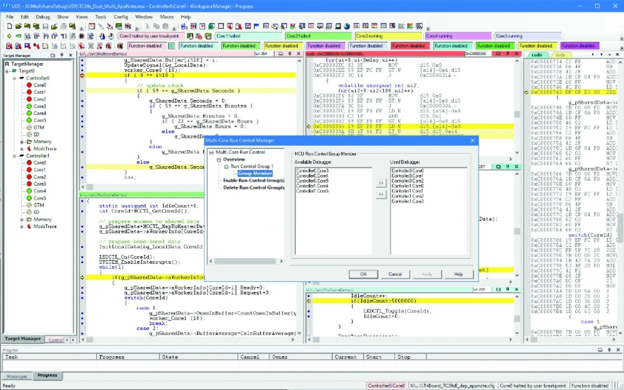 Bild 2 zeigt eine gemeinsame Debug-Session der beiden Aurix-Mikrocontroller innerhalb der UDE-Benutzeroberfläche. Alle Kerne der beiden Multicore-SoCs sind gleichzeitig zugänglich und kontrollierbar, die Systemzustände werden konsistent dargestellt. Selbstverständlich steht darüber hinaus auch das etablierte Multicore-Run-Control-Management der UDE für das Debugging von Multi-Aurix-Plattformen zur Verfügung. Dabei können alle oder eine definierbare Anzahl von Kernen der beiden Controller in einer Run-Control-Gruppe zusammengefasst werden. Der im Screenshot erkennbare geöffnete Multicore-Run-Control-Manager wurde durch den Anwender in diesem Beispiel so konfiguriert, dass nur eine Auswahl von sieben der insgesamt zwölf verfügbaren Kerne in der Run-Control-Gruppe enthalten ist. Für alle Kerne dieser Gruppe sind Breakpoints, manuelles Anhalten und natürlich auch synchrones Wiederloslaufen gemeinschaftlich wirksam, während alle anderen Kerne davon unberührt bleiben. So laufen diese im abgebildeten Beispiel auch dann weiter, wenn der zur Run-Control-Gruppe zugehörige Core-0 des ersten der beiden Aurix-Controller auf einen Breakpoint läuft. Einen schnellen Überblick über den jeweiligen Zustand der einzelnen Cores der beiden Controller erhält der Anwender über den Target-Manager, der sich in der Abbildung auf der linken Seite befindet.