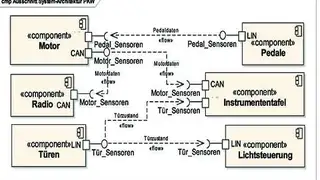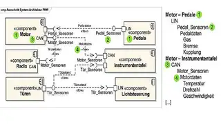 Nun soll aus einem Ausschnitt einer Systemarchitektur eines Pkws automatisiert eine Schnittstellenbeschreibung erstellt werden. Sie soll aufzeigen, welche Systemkomponenten auf Basis welches Kommunikationssystems miteinander kommunizieren und welche Informationen dabei ausgetauscht werden. Je nach Projekt- oder Unternehmensvorgabe kann eine nähere Beschreibung zum Aufbau einer Kommunikation zwischen zwei Kommunikationspartnern erfolgen.
