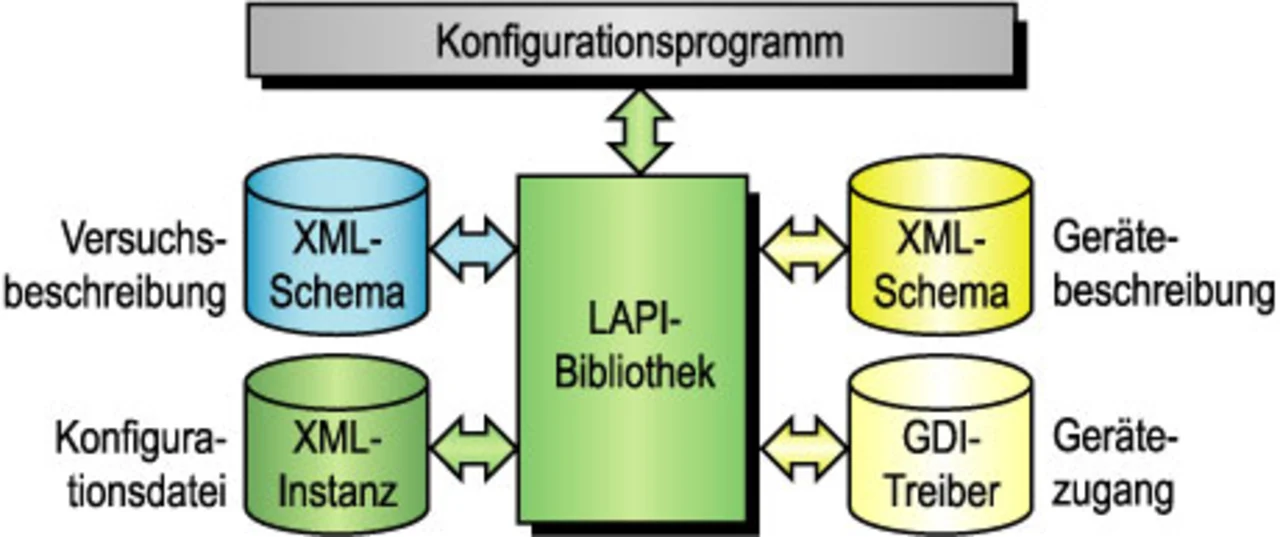 In einem gemeinschaftlich von BMW, DaimlerChrysler und Porsche geleiteten Projekt zur herstellerunabhängigen Konfiguration von Datenloggern für den Bereich Gesamtfahrzeug-Engineering und -Erprobung wird von dem oben beschriebenen Konzept Gebrauch gemacht. Unter dem Begriff LAPI (Logger-API) wird eine Software-Bibliothek entwickelt, die Zugriffe auf die Gerätebeschreibungsdateien (Datenlogger und Messmodule in XML-Schema formuliert) und auf die Konfigurationsdateien (XML Instanz) ermöglicht und damit als Basis für anspruchsvolle Konfigurationsapplikationen dient (Bild 6). Die Gerätebeschreibungsdateien und die zugehörigen GDI-Treiber werden von den Geräteherstellern entwickelt. Die Software-Bibliothek und ein XML-Schema zur Darstellung des gesamten Versuchs werden von der Firma MFP entwickelt. In diesem Projekt wird kein Koordinator eingesetzt, da es hier ausschließlich um die Konfiguration von Datenloggern und Messmodulen geht und das Parsen/Interpretieren der Konfigurationsdatei mit entsprechender Bedienung der Gerätetreiber von der LAPI-Bibliothek unterstützt wird.