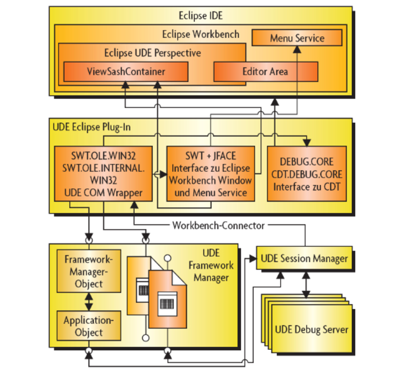 Um dieses Dilemma zu eliminieren, stellen moderne Tools wie die Universal Debug Engine inzwischen ihre komplette Funktionalität ohne Abstriche in einer eigenen Debug-Perspektive zur Verfügung. Möglich wird dies durch den komponentenorientierten Tool-Aufbau mit strikter Trennung von Funktion und Bedienoberfläche. Ein relativ kleiner, in Java geschriebener Wrapper, das UDE Eclipse Plugin, verbindet Eclipse mit den Funktionskomponenten der UDE. Hierfür werden neben dem SWT-basierten Window- und Menü-Service der Eclipse-Workbench auch das Debug- Interface eines installierten CDT sowie Schnittstellen des SWT zu Win32-Native-Funktionen genutzt (Bild 3).