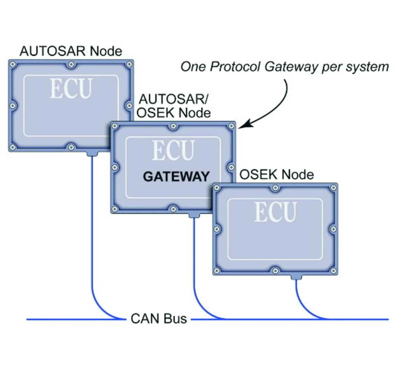 Die Implementierung der Protokoll-Gateway-Software (PGW) ist der Schlüssel für die Interoperabilität zwischen den verschiedenen Netzwerkmanagement-Protokollen. Das Gateway synchronisiert das Shutdown/Wakeup-Timing zwischen mehreren Protokollen auf einem oder mehreren Netzwerken. Dies geschieht mit Hilfe einer PGW-bestückten ECU pro System (Bild 2).