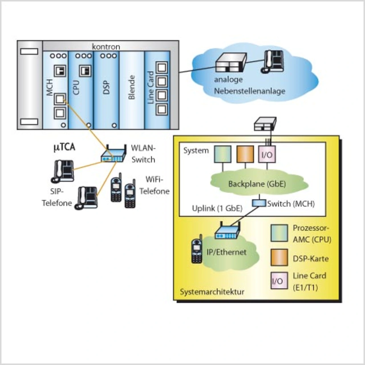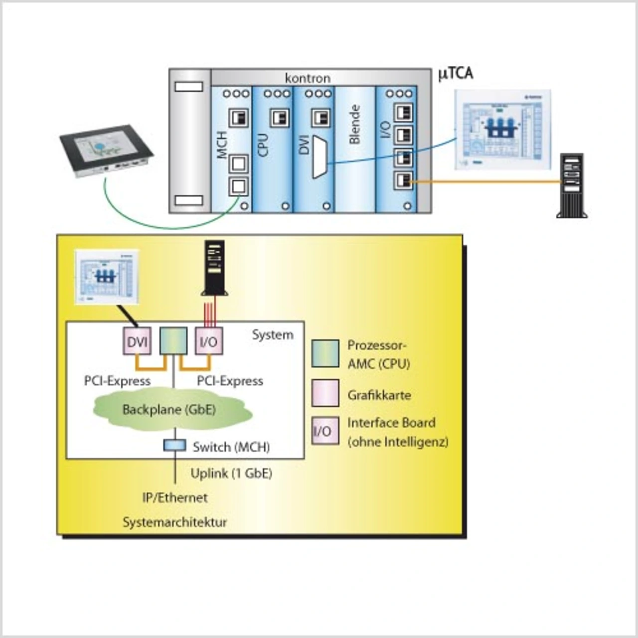 Wie lassen sich nun AMC-Systeme in der Praxis realisieren? Einige Muster zum Systemdesign nach dem MicroTCA-Standard werden hier stellvertretend vorgestellt. Bild 4 zeigt ein Basissystem mit Kommunikation über Ethernet. Ein Anwendungsfall wäre eine Nebenstelle für Voice over IP mit Anbindung an ein traditionelles Telefonnetz. Als AMCs sind ein Prozessor, ein Signalprozessor und eine Schnittstellenbaugruppe im Einsatz. Alle AMCs kommunizieren miteinander über Ethernet. Das Prozessor-AMC ist die Steuerzentrale und verantwortlich für den Auf- und Abbau von Verbindungen. Der Signalprozessor codiert den Datenstrom zwischen IP-Paketen und kontinuierlichem Datenstrom um, die Schnitstellenbaugruppe erledigt die Anbindung an das Telefonnetz. Die Anwendung lässt sich strukturieren nach Protokollen für Steuerung (Control Plane) und Datenstrom (User Plane) sowie nach Protokollschichten. Für die Systemarchitektur genügt Ethernet an den AMC-Ports 0 und ein Ethernet-Switch im MCH. PCI in der seriellen Version PCI-Express ist ebenfalls Bestandteil von AMCSystemen (AMC-Ports 4 – 7). Bild 5 zeigt eine Musterkonfiguration mit einem Prozessor-AMC und zwei Peripheriekarten (Grafikkarte für ein externes Display und Karte für externe Schittstellen). Im einfachsten Fall werden die AMC-Ports über einen PCI-Express-Switch zum MCH geführt. Auf diese Weise kann der Prozessor alle vier PCI-Express-Verbindungen für beide Peripheriegeräte nutzen. Für externe Displays gibt es übrigens eine interessante Alternative, die kein Videokabel und kein Grafik-AMC benötigt: Bei Verwendung eines Displays mit eingebautem Web-Browser (z.B. Kontron MicroClient) erfolgt der Anschluss über das Ethernet über beliebige Entfernungen. Auf dem Prozessor-AMC läuft in diesem Fall ein Web-Server, der grafische Benutzeroberflächen durch dynamische Web-Seiten unterstützt.