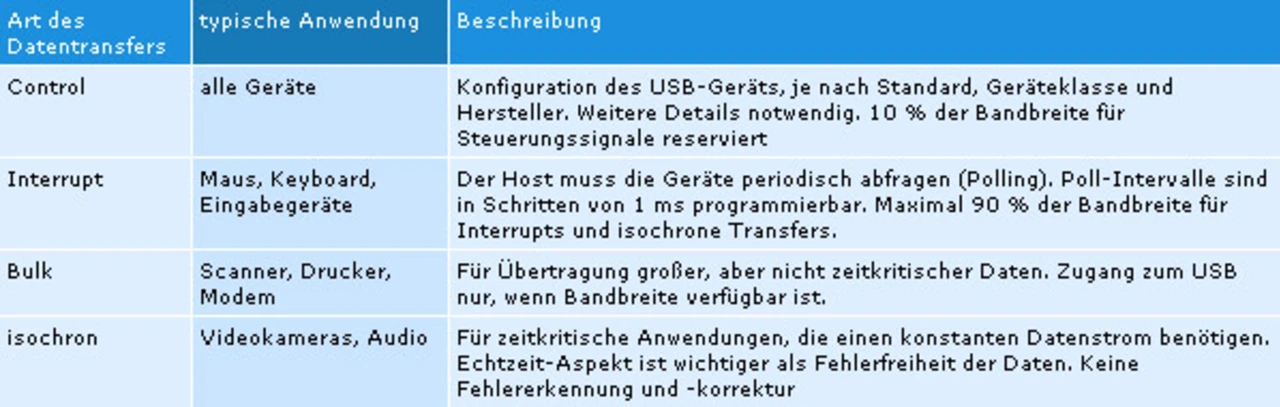 Es gibt vier Arten der USB-Datenübertragung: Control, Interrupt, iso-chron und Bulk (siehe Tabelle). Control-Transfers identifizieren ein Gerät und richten es zur Kommunikation mit dem USB-Host und den anderen drei Übertragungsarten ein. Jede Übertragung setzt sich wiederum aus vier Transaktionsarten zusammen – IN, OUT, SOF (Start-Of-Frame) und Set-up –, die unter Einsatz von drei Paketen aufgebaut sind. Dem ersten „Token“-Paket folgen ein Datenpaket und ein Handshake-Paket. Die Pakete enthalten einen „Packet Identifier“ (PID), von dem es 16 Arten gibt, sowie einen durch die PID-Art und die Prüfsumme (CRC) bestimmten Inhalt. Das Spektrum an Paketen mag auf dem Papier ein wenig verwirrend erscheinen – man versteht sie jedoch schnell, sobald man mit dem Design beginnt.