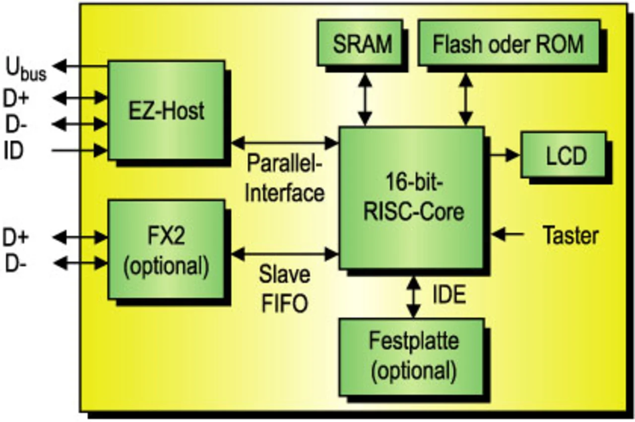 Das folgende Beispiel zeigt anhand eines USB-Sticks, wie die On-The-Go-Spezifikation in einem Massenspeichergerät in die Praxis umgesetzt wird. Da es sich bei der Anwendung um PC-Speicherung handelt, wird eine Emulation des Dateisystems sowie irgendeine Form von SCSI-Befehlen erforderlich sein (Bild 3). Der CY7C67300 enthält einen 16-bit-RISC-Core und bietet Schnittstellen u.a. zu HPI, SPI, DIE, UART und Speichern, plus GPIOs. Der CY7C67300 setzt entweder eine (serielle) SPI- oder eine (parallele) HPI-Schnittstelle ein. Der einzige wirkliche Unterschied besteht darin, dass seriell langsamer ist. Außerdem kann der CY7C67300 zudem sowohl als Host wie auch als Gerät in derselben Konfiguration funktionieren, was für den Anschluss an einen PC nützlich ist. Das bedeutet, dass ein Port als Host und der andere als Device laufen kann (Bild 4). Der IDE-Port auf dem Chip lässt sich mit einer Festplatte verbinden, um eine HDD-Schnittstelle zu liefern.