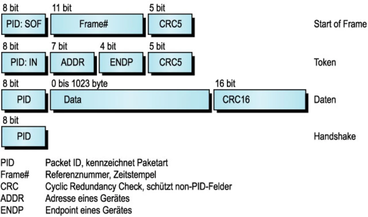 Angenommen, es sollen z.B. Daten vom Host zu einem USB-Slave-Gerät gesandt werden. Der Host und das Ziel wissen voneinander, weil der Host in regelmäßigen Zeitabständen SOF-Pakete aussendet. Diese beginnen mit dem PID SOF und enthalten eine Frame-Nummer und danach eine CRC (Bild 2). Anschließend sendet der Host ein IN-Paket-Token an das Zielgerät mit der Anforderung, dass das Gerät ein Datenpaket zurücksendet. Das Token-Paket ist der Beginn einer Transaktion. Der PID umfasst 8 bit und kann IN, OUT oder SETUP sein. Dann folgt die 7-bit-Geräteadresse. Der Geräte-adresse folgt eine 4-bit-Endpoint-Adresse, die mit einer CRC abgeschlossen wird. Bei einem Datenpaket wird es sich um eine 8-bit-PID, eine Nutzlast zwischen 0 und 1023 Byte plus einer CRC handeln. Nach erfolgreichem Empfang sendet der Host einen 8-bit-Handshake-PID zum Abschluss der Transaktion aus und meldet den Status.