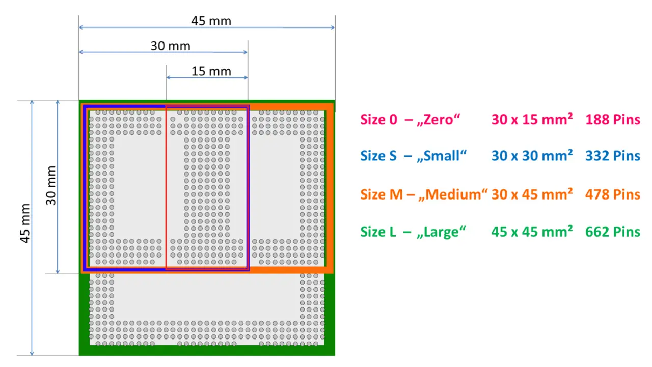 Die Standardization Group for Embedded Technologies (SGET) hat das schon vor längerer Zeit erkannt und in ihrer Standardisierungsgruppe SDT.05 eine Spezifikation für Open-Standard-Modules (OSM) zum Auflöten erarbeitet. Die aktuelle Version 1.1 der Spezifikation sowie ein Design-Guide hierzu wurden bereits im letzten Jahr veröffentlicht. So können Entwickler seither hierzu standardkonforme CoMs für gängige Embedded-Architekturen umsetzen. Hierzu bietet der OSM-Standard vier untereinander abwärtskompatible Formfaktoren an (Bild 1). So lassen sich Größe und Pinzahl entsprechend dem jeweiligen Bedarf skalieren. Weitere Kosten- und Qualitätsvorteile gegenüber steckerbasierten CoMs sind das einfachere Lagern der Module beispielsweise auf Gurten sowie das vollautomatische Bestücken und Testen. Weil die als Schnittstelle verwendeten LGAs denen von üblichen Chip-Gehäusen entsprechen, bezeichnet man OSM-CoMs auch als System-in-Package (SiP).