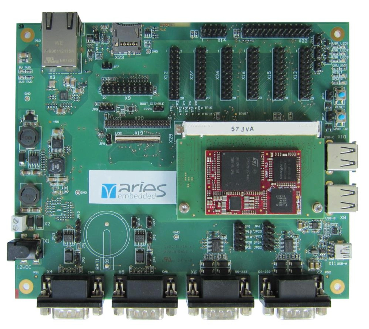 Aries Embedded hat sich beim Entwurf des CoM beziehungsweise SiP »MSMP1« bewusst nicht für den kleinstmöglichen Formfaktor »Small« entschieden, sondern für den immer noch sehr kompakten Formfaktor »Medium«. Die hier verfügbaren 476 Pins ermöglichen es, alle wichtigen Pins des Prozessors transparent zugänglich zu machen und das CoM mit bis zu 4 GB schnellem LPDDR3-RAM zu bestücken. Einen hohen Speicherdurchsatz gewährleistet hierbei die Anbindung über eine 32-bit-Schnittstelle. Zudem unterstützt das Board bis zu 64 GB eMMC-NAND-Flash-Speicher. Weitere, direkt unterstützte Schnittstellen sind 3x USB 2.0 Host/On the go (OTG), 2x CAN, Ethernet (10/100/1000 Mbit/s), Kamera, Parallel Display Port, UART und SPI.