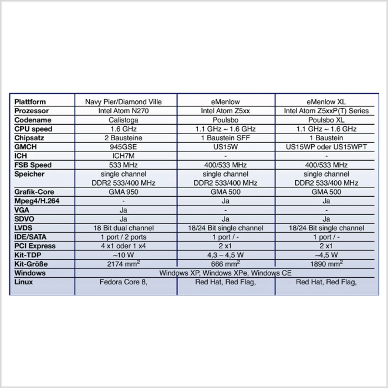 Vom Atom-Prozessor gibt es mittlerweile verschiedene Varianten. Auf der Embedded Roadmap von Intel, die auf Langzeitverfügbarkeit und damit auf den industriellen Markt zielt, findet man gegenwärtig die Z-Serie sowie den N270, der auch in Netbooks Verwendung findet. Zur embedded world in Nürnberg wurde von Intel die »eMenlow XL Platform« vorgestellt: Die Z5xxPT-Serie ist für den erweiterten Temperaturbereich von -40°C bis +85°C spezifiziert. Die High-end-Version Z530 mit 1,6 GHz unterstützt bereits Hyperthreading, künftige Atom-Versionen (Z520, Z540, Z550) werden dieses Feature auch integriert haben. Die gesamte Atom-Architektur basiert auf dem Pentium M, wurde aber vor allem entsprechend den Designzielen Kostenersparnis (geringere Größe des Dies) und Energieeffizienz angepasst. Aufgrund ihrer Eigenschaften wie x86-Kompatibilität, bei gleichzeitig für x86-Plattformen sehr guter Energieeffizienz und der Fähigkeit Windows XP embedded oder sogar Vista zu benutzen, eröffnet die Atom-Plattform auch völlig neue Möglichkeiten bei Embedded-Applikationen.