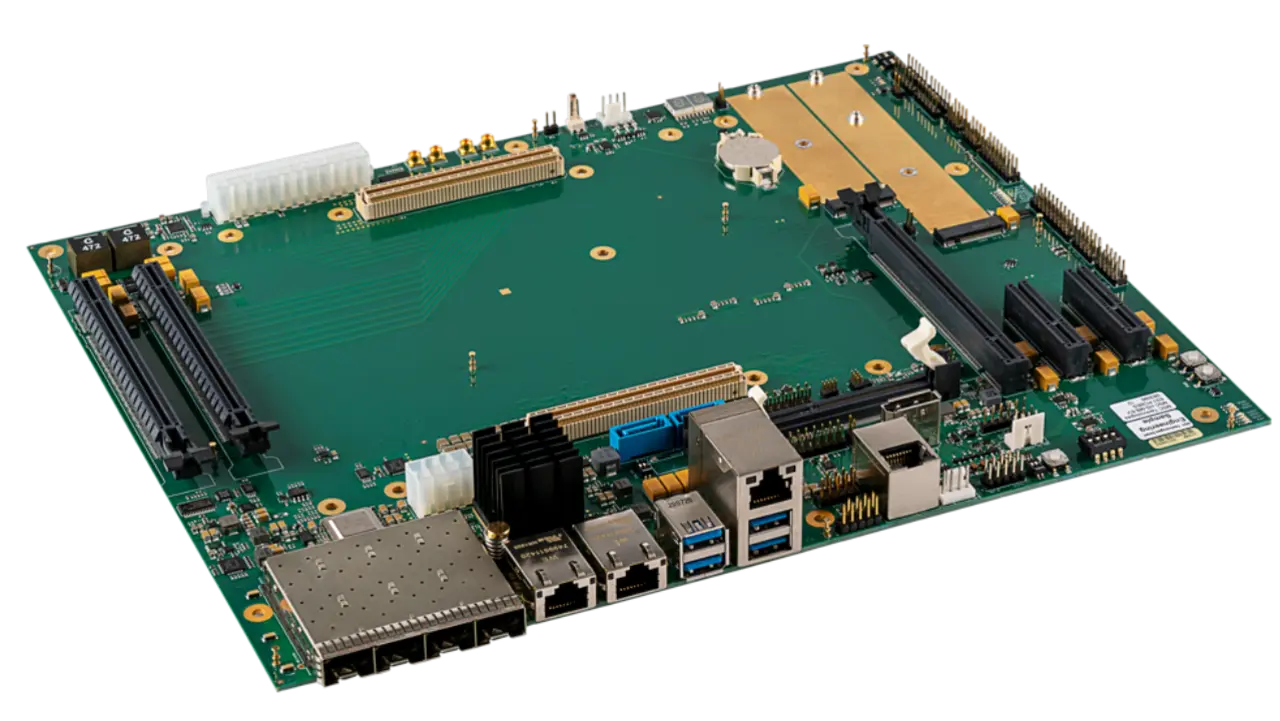 Genügend Platz für Schnittstellen ist auf dem Carrier vorhanden, zum Beispiel PCIe x16, je zweifach PCIe x8 und x4 sowie zweifach M.2 mit PCI x4. Alle vorhandenen PCIe-Slots unterstützen bis zu Gen 4. Zur Anbindung an das Netzwerk verfügt das Carrierboard über vier SFP28-Kartenkäfige für bis zu 25G Ethernet pro Port, zwei 10GBASE-T-Konnektoren und einen 1000BASE-T/2.5GBASE-T-Konnektor. Speichermedien werden über zwei SATA-Anschlüsse mit bis zu 6 Gbit/s integriert. Externe Geräte können Entwickler über je zweifach USB 3.2 Gen 2 (10 Gbit/s) und USB 3.2 Gen 1 (5 Gbit/s) anschließen. Zusätzlich stehen zwei UART-Ports, ein Konnektor mit zwölf GPIO-Ports und Anschlüsse für ein optionales BMC-Modul und I/O Break-out bereit. Ein PWM gesteuerter 4-Pin-Anschluss für einen Lüfter ist ebenfalls vorhanden.