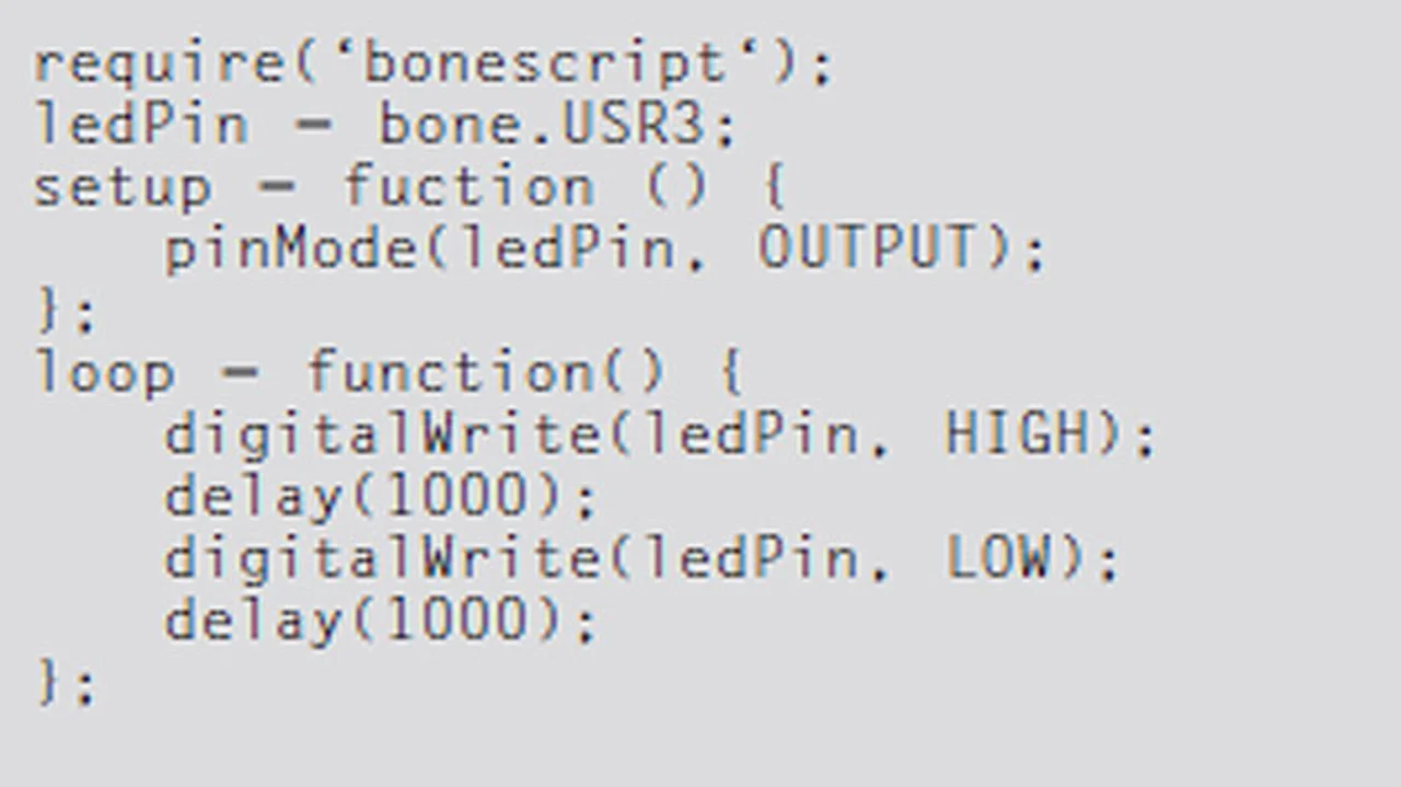 Wie die meisten traditionellen IDEs für eingebettete Anwendungen verfügt auch Cloud9 über Arbeitsbereiche für die Bearbeitung, Validierung, das Debuggen und Testen von Code. Das Schreiben von Code ist ein interaktiver Prozess, der die Prüfung von Variablen und Syntax während der Eingabe umfasst. Cloud9 bietet viele einfache Beispiele, die in node.js JavaScript geschrieben wurden und die Bonescript-Library umfassen. Das Code-Beispiel „blinked.js“ (siehe Listing 1) aktiviert eine der benutzerseitigen LEDs (USR3). Dies kann auf die Verwendung einer der GPIO-Pins erweitert werden, indem eine LED und ein zugehöriger Pull-up-Widerstand dem entsprechenden GPIO-Pin hinzugefügt und die Zuweisung der Veriable ledPin zum jeweiligen GPIO geändert wird, z.B. bone.P8_3.