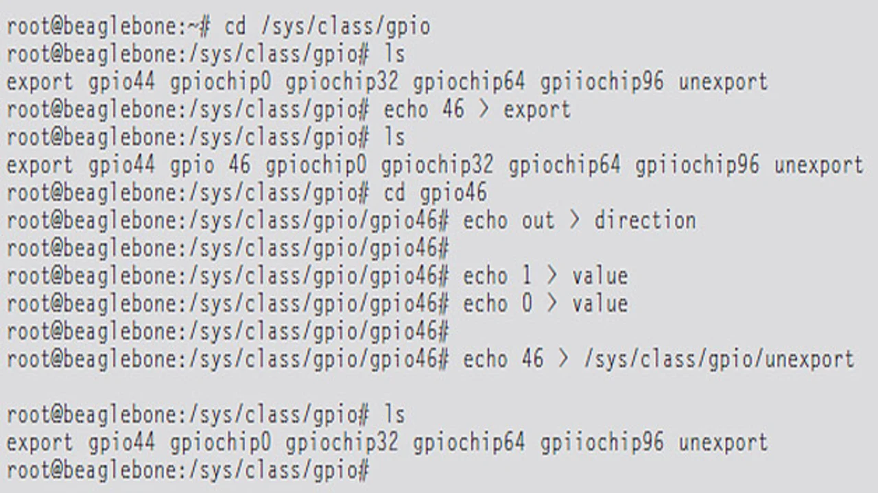 Auf die GPIO kann zudem direkt aus dem Linux-Betriebssystem heraus zugegriffen werden. Dies kann direkt über die Platine oder über Remote-Zugriff via SSH erfolgen. Es erfordert zunächst eine korrekte Linux-Signalbezeichnung, die von einem speziellen GPIO-Pin erkannt wird. Weiterhin erfordert es fundierte Kenntnisse über die Arbeit auf Linux-Befehlszeilenebene. Jeder GPIO-Pin verfügt, wenn er verwendet wird, über ein Verzeichnis im Parent-Verzeichnis /sys/class, das die Linux-Signalbezeichnung enthält. So können potenzielle Signal-/GPIO-Konflikte erkannt werden, wenn eines oder mehrere Capes verwendet werden. Beispielsweise wird der Anschluss P8.pin 16 als GPIO46 gekennzeichnet - siehe Listing 2.