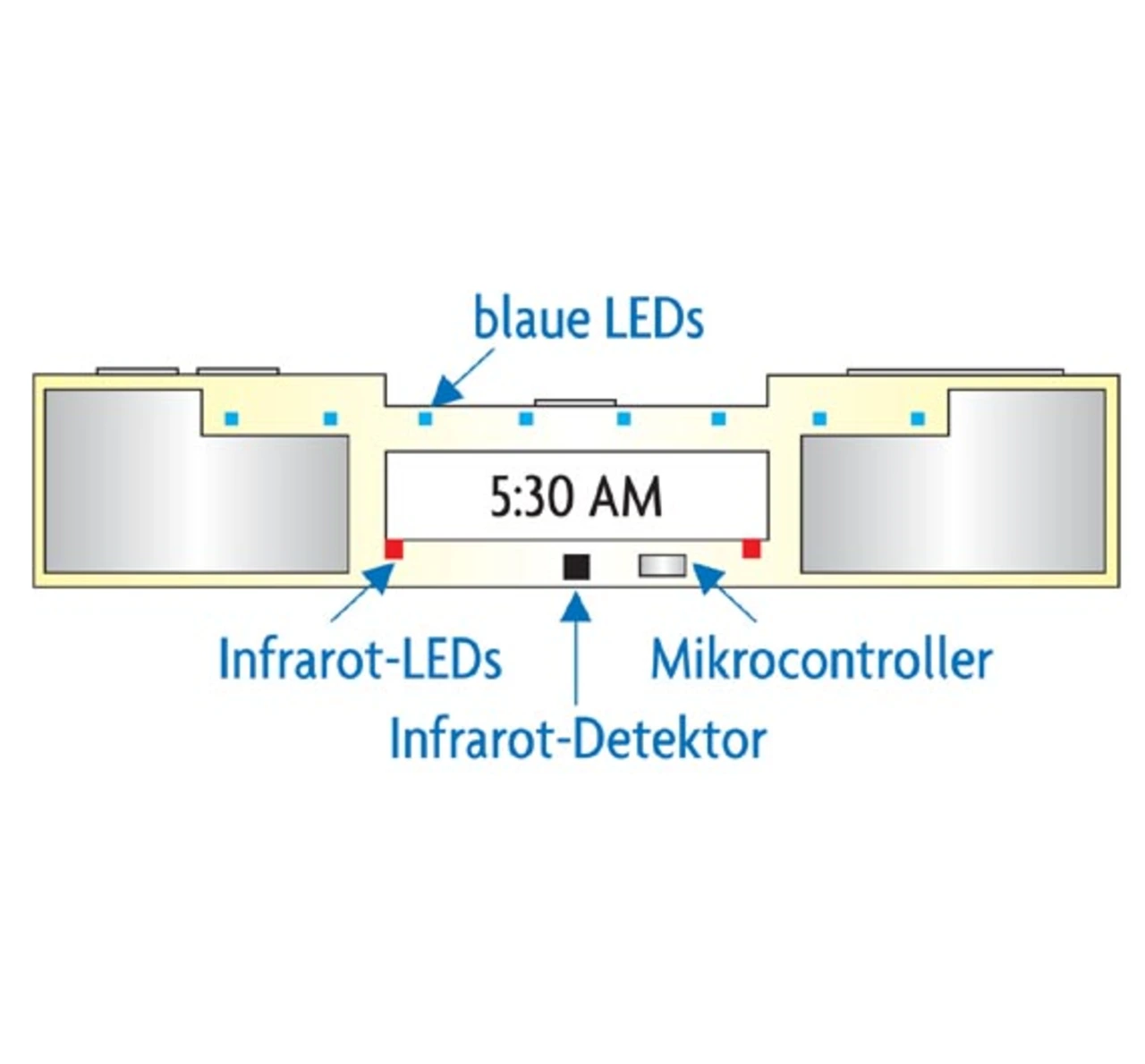 Die berührungslose Slider-Funktion lässt sich nahezu in jedes Produkt mit Mensch-Maschine-Schnittstelle integrieren, wie z.B. in den anfangs beschriebenen Radiowecker. Bild 2 zeigt das Prinzip dieser Funktion: Ein 8051-Mikrocontroller übernimmt die Steuerung der Infrarot-LEDs, so dass sie jeweils abwechselnd mit Impulsen versorgt werden. Der Mikrocontroller verarbeitet den Ausgangswert des Sensors, berechnet die Position der Hand und zeigt optional die relative Position der Hand über eine Reihe blauer LEDs auf der Geräteoberseite an. Diese sichtbare Rückkopplung kann bei der Zeiteinstellung oder Lautstärkeregelung hilfreich sein.