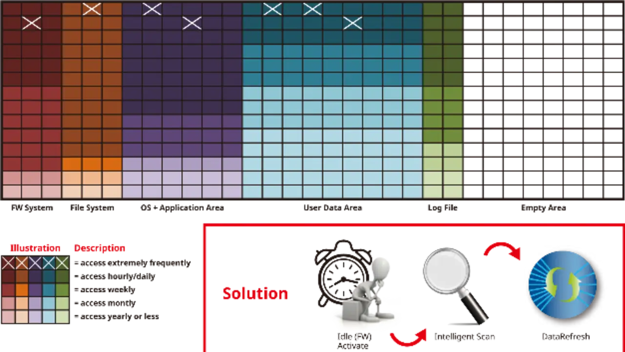 Einer der wichtigsten Einflüsse, die die Datenerhaltung beeinträchtigen, ist eine höhere Temperatur des NAND. Die FerriSSD enthält einen zum Patent angemeldeten Überwachungsalgorithmus, der die kumulierten Temperaturwerte der Sperrschicht, die Anzahl der P/E-Zyklen, die Einschaltzeit der SSD und andere wesentliche Referenzpunkte protokolliert, um den Daten-Refresh der NAND-Zellen dynamisch zu priorisieren. IntelligentScan und DataRefresh wirken zusammen, um die Datenerhaltung zu erhöhen, bevor die Daten nicht mehr lesbar sind.