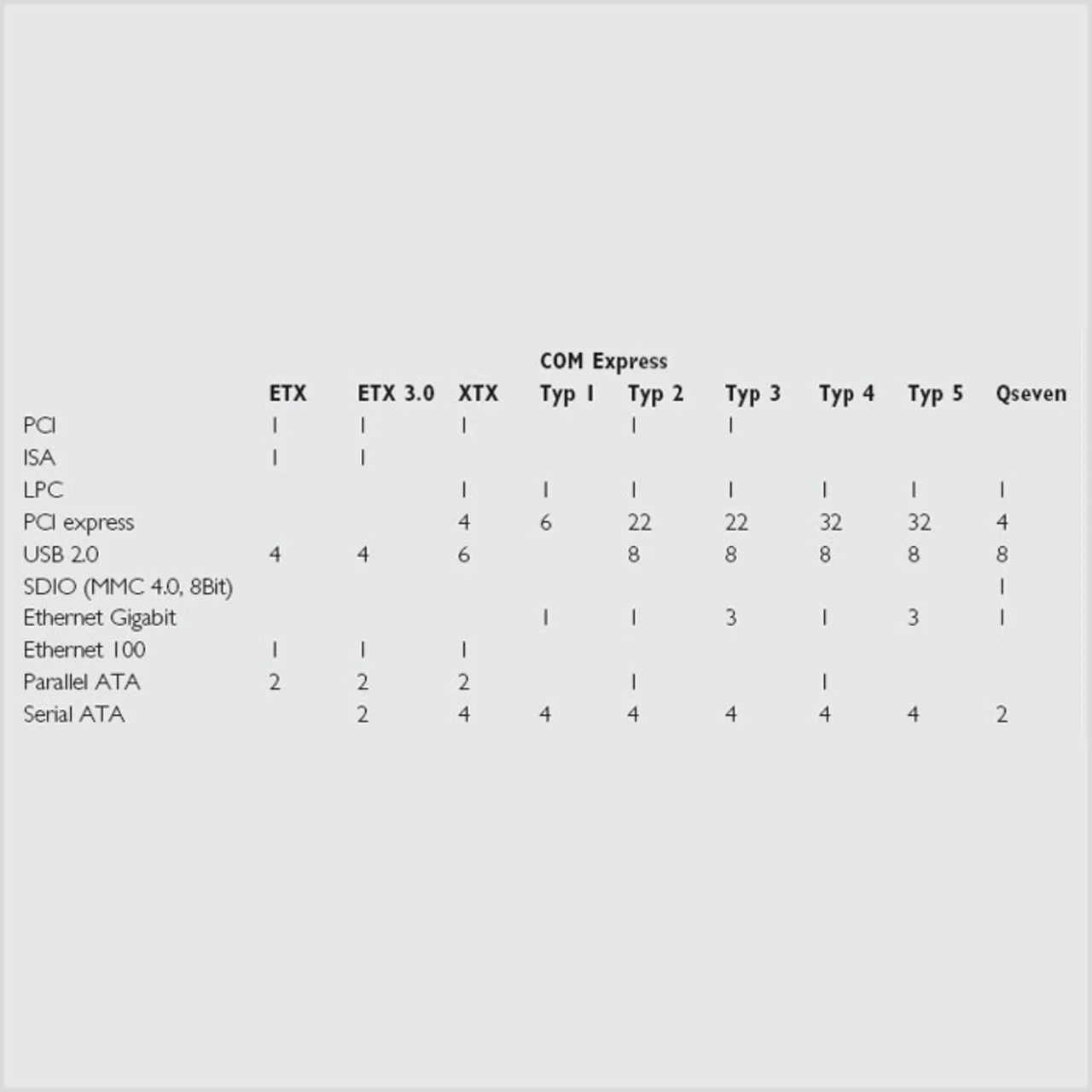 Um innerhalb der Spezifikation vielfältige Leistungsbereiche abzudecken, sind fünf unterschiedliche Pinbelegungen definiert (Tabelle 1). Das scheint auf den ersten Blick etwas verwirrend, ist aber letztlich eine klare, zukunftsorientierte Definition der maximal 440 verfügbaren Pins. Die meisten am Markt erhältlichen COM-Express-Module sind so genannte »Typ-2-Module «, was daran liegt, dass die verfügbaren Schnittstellen heutiger Chipsätze dieser Definition sehr nahe kommen. Die höheren Typnummern 3 bis 5 verzichten auf die mittlerweile überholten Schnittstellen wie paralleles IDE oder den PCI-Bus, um zusätzliche Ethernet- und PCI-Express-Lanes anbieten zu können.