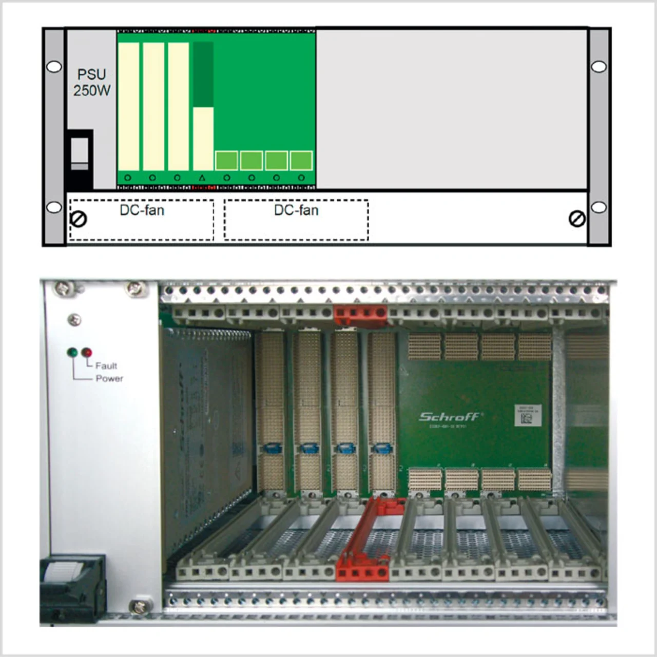So gibt es beispielsweise von Schroff bereits eine Hybrid-Busplatine mit acht Steckplätzen, die folgendermaßen aufgebaut ist (Bild 2): Mit vier herkömmlichen CompactPCI-Slots links und vier neuen Peripherie-Slots für CompactPCI Plus rechts befindet sich der System-Slot in der Mitte (Vierter Slot von links). Um mit den vier CompactPCI-Plus-Slots kommunizieren zu können, muss im System-Slot eine CPU-Karte stecken, die PICMG 2.30 unterstützt, also die fest definierten seriellen Schnittstellen auf J2 belegt. PICMG 2.30 kann – begrenzt durch den 2-mm-Stecker – bis zu vier CompactPCI-Plus-Slots ansteuern, wobei zwischen den Peripherie-Slots keine Unterschiede in der Signalbelegung bestehen. Das heißt, dass an jedem Platz je ein PCI-Express ×1, USB und Serial-ATA zur Verfügung stehen. Hierfür muss die unterste Steckerreihe immer bestückt sein. Von den insgesamt maximal sechs CompactPCIPlus-Steckern pro Slot benutzt diese Backplane außerdem die oberste Steckerreihe und unterstützt damit das optionale Ethernet.