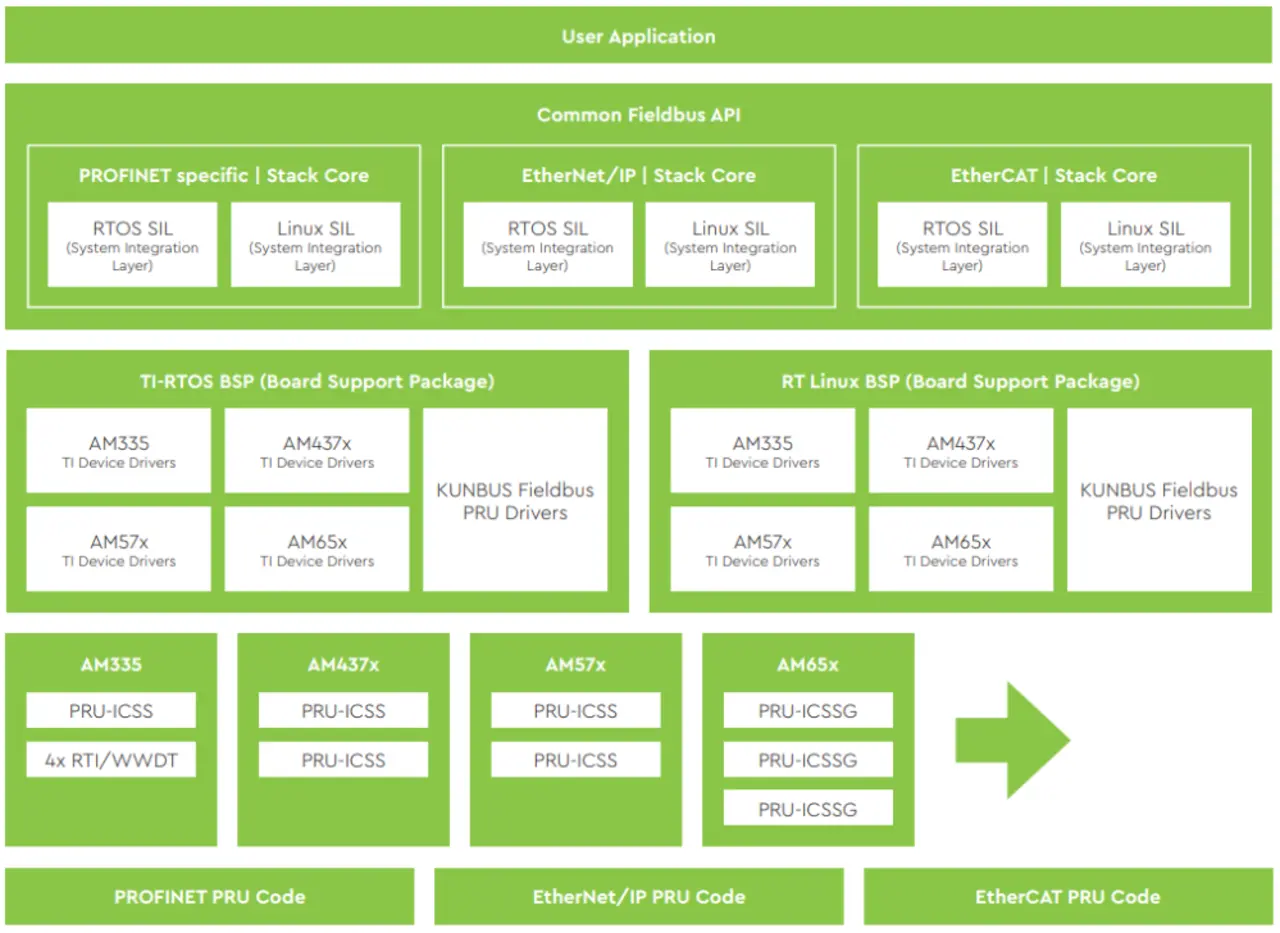Das Board Support Package (BSP) des TQMa65xx baut auf dem Standard BSP von TI auf und ist an die Hardware des TQMa65xx und MBa65xx angepasst und konfiguriert. In ihm werden alle üblichen Schnittstellen unterstützt, die die CPU bereitstellt (Bild 5). Weiterhin ist das Design des TQMa65xx darauf ausgelegt, dass sich die Software-Anwendungen der Firma Kunbus integrieren lassen. Kunbus ist spezialisiert auf das Entwickeln von Feldbusprotokollen auf Basis der Sitara-Prozessoren von TI. Die Software Stacks ermöglichen es dem Anwender, auf dem Standard-BSP aufzusetzen und das gewünschte Feldbussystem zu integrieren. Zukünftig soll es die in der Industrie standardisierten Ethernet-basierten Feldbusse Profinet, Ethernet/IP und EtherCat unterstützen. Building Blocks, bestehend aus dem TQ-BSP und den optionalen Feldbus-Stacks von Kunbus, ermöglichen dem Software-Entwickler ein schnelles und effizientes Realisieren einer feldbusfähigen Anwendung.