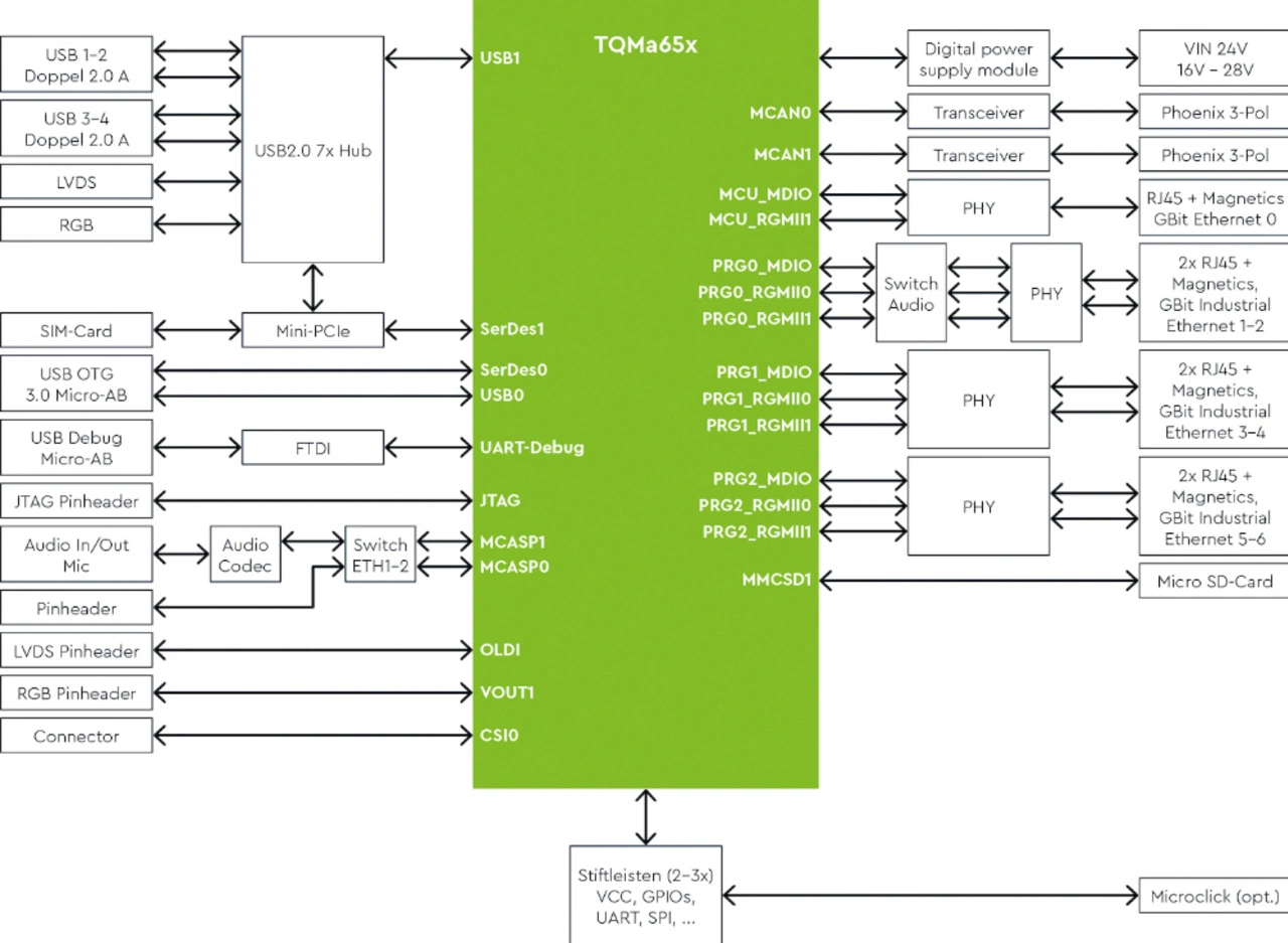 Anwender können unmittelbar mit der eigenen Software-Entwicklung starten. Ebenso lässt sich das MBa65xx als Referenzdesign verwenden und bietet somit eine ausgefeilte Grundlage für ein eigenes Baseboard Design. Optionale Software Stacks für Feldbussysteme wie Profinet, Ethernet/IP oder EtherCAT legen eine verlässliche Basis für die industrielle Kommunikation über Feldbusse.