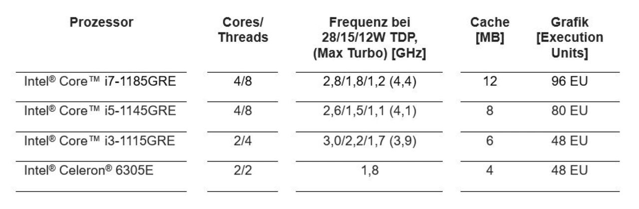 Die robusten COM-Express-Compact-Type-6-Module mit der 11. Intel-Core-Prozessorgeneration, gelötetem RAM und In-Band Fehlerkorrektur ECC (IBECC) sind in den im Bild dargestellten Standardkonfigurationen erhältlich, wobei kundenspezifische Anpassungen auf Anfrage möglich sind.
