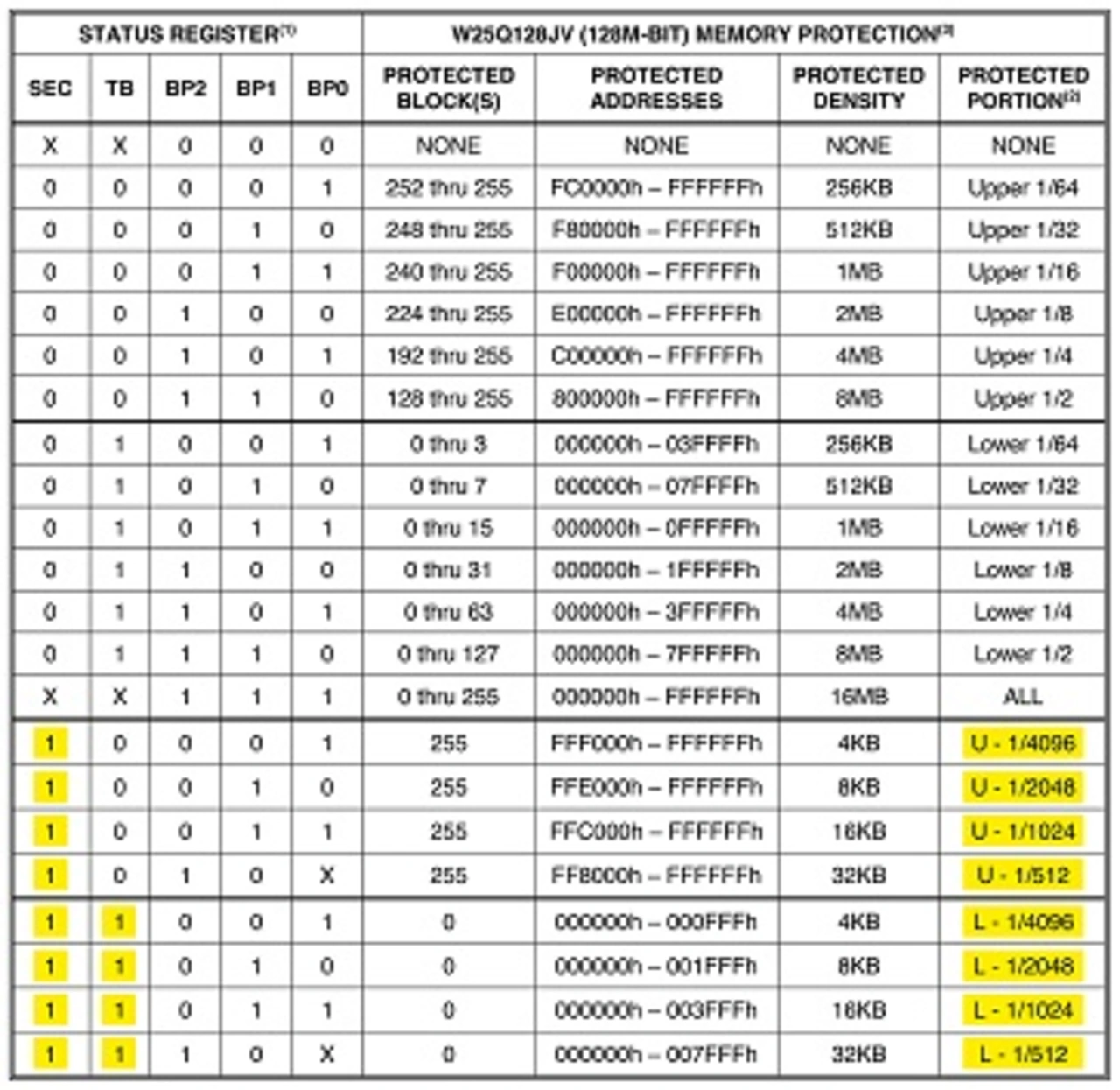 In Tabelle 2 ist ein weiteres von Winbond eingeführtes Merkmal zu sehen (gelb markiert): das TB-Registerbit (Top/Bottom). Standardmäßig (TB=0) beginnt die Zuweisung von Block- oder Sektorschutz am unteren Ende des Speicher-Arrays von Adressen. Dies liegt daran, dass die meisten CPUs vom unteren Ende des Arrays booten. Daher sollte der geschützte Bereich, der den Bootcode enthält, unten liegen, um die schnellste Ausführung und die effizienteste Nutzung des Hauptspeichers zu gewährleisten. Intel-CPUs booten jedoch von oben. Mit dem TB-Bit gibt das Unternehmen Nutzern von Intel-Chips die Möglichkeit, Speicheradressen am oberen Ende des Arrays für den Block- oder Sektorschutz zu vergeben, indem TB=1 im Statusregister konfiguriert wird.