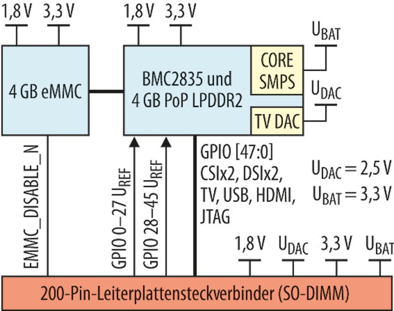 Mit dem Modul allein lässt sich nichts anfangen, denn es wird ein entsprechendes Umfeld mit Spannungsversorgung, Peripherie-Chips und Anschlüssen benötigt. Hierfür kann eine eigene individuelle Hardware entwickelt werden, die lediglich diejenigen Komponenten beinhaltet, die für die jeweilige Embedded-Applikation benötigt werden, was einen direkten Einfluss auf den Stromverbrauch hat und außerdem zu sehr kompakten Lösungen führen kann. Wie bei den bisherigen Raspberry-Pi-Modellen werden wieder die drei Spannungen von 1,8 V, 2,5 V und 3,3 V für den BCM2835 und den Speicher benötigt, wie es in der Prinzipschaltung (Bild 2) zu erkennen ist.