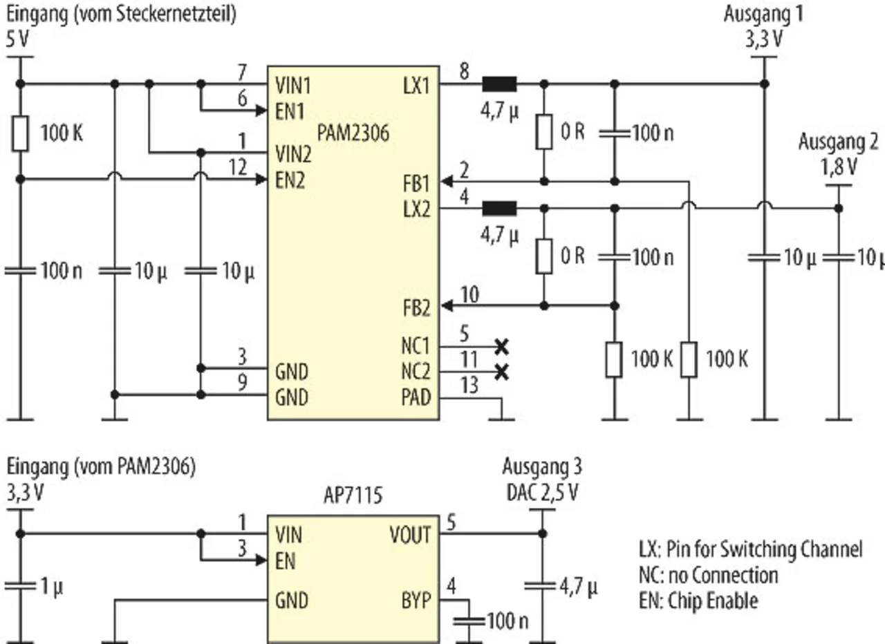 Grundsätzlich weisen Linearregler im Gegensatz zu Schaltreglern einen geringen Wirkungsgrad auf und setzen die überschüssige Leistung in Wärme um, so dass sie für Low-Power- und/oder Embedded-Applikationen eher ungeeignet sind. Dieser Tatsache wurde auch beim Raspberry-Pi-I/O-Board Rechnung getragen, denn hier wird ein Schaltregler (PAM2306) der Firma Diodes Incorporated [3] für die Spannungsumsetzung verwendet. Die Schaltung (Bild 4) basiert auf einer Applikation von Diodes Incorporated und kann aus einer Eingangsspannung gleich zwei unterschiedliche Ausgangsspannungen (3,3 V, 2,8 V, 2,5 V, 1,8 V, 1,5 V, 1,2 V) generieren. Außerdem ist eine individuell einstellbare Ausgangsspannung per Beschaltung konfigurierbar. Beide Ausgänge sind in der Lage, bis zu 1 A zu liefern. Die Eingangsspannung darf im Bereich von 2,5 V bis zu 5,5 V liegen, was bedeutet, dass auch eine Versorgung durch Batterien und Akkus möglich ist. Der PAM2306 unterstützt einen Shutdown-Modus, der beim I/O-Board allerdings nicht eingesetzt wird und mit einem typischen Strom von 100 mA auch nicht als besonders effektiv betrachtet werden kann. Auf dem Raspberry Pi I/O Board werden mit dem PAM2306-Regler die beiden Ausgangsspannungen von 3,3 V und 1,8 V generiert, während für die 2,5 V ein separater Linearregler (Low Dropout) vom Typ AP7115 (max. 150 mA), der ebenfalls von der Firma Diodes Incorporated stammt, eingesetzt wird.