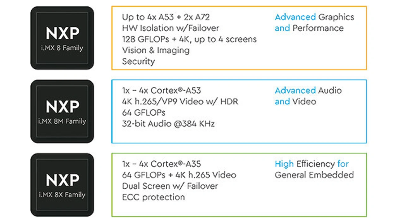 Die i.MX-8-CPU-Serie von NXP, besteht aus insgesamt drei Produktfamilien. Sie stellen jeweils mehrere Pin-kompatible CPU-Varianten bereit und kombinieren zahlreiche Funktionen, Schnittstellen und Leistungsklassen für zukunftsorientierte Designs. Gemäß den Anforderungen, die an das jeweilige Design gestellt wird, können Entwickler einen Kern auswählen, der am besten passt. Die i.MX-8-CPU-Serie stellt somit eine geeignete Plattform für Anwendungen aus verschiedenen Bereichen dar: Von Mensch-Maschine-Schnittstellen (HMIs) über Industriesteuerungen für IIoT und Industrie 4.0, intelligente Kameras, Gebäude- und Home-Automatisierung bis hin zu medizinischen Anwendungen.